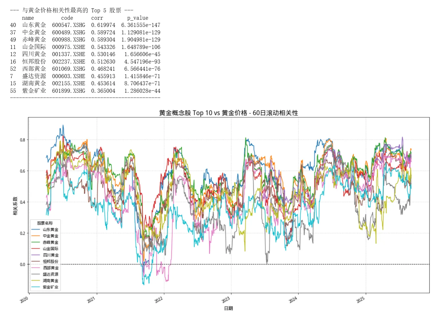 最近随着美联储降息确定性提升,金价又开始拉升,不过同样都是黄金资源股,表现却各有差异,所以拿2020年以来黄金概念股的股价和黄金价格(Au8888)简单做了一点相关性和归因分析,结果如下: