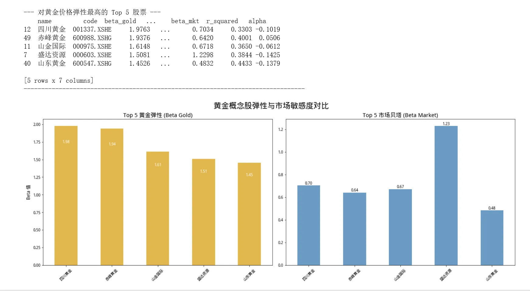 第二张图是使用市场因子(上证指数)+金价对股价进行双因子回归后,股价对金价弹性(可以理解成杠杆)最大的五只股票