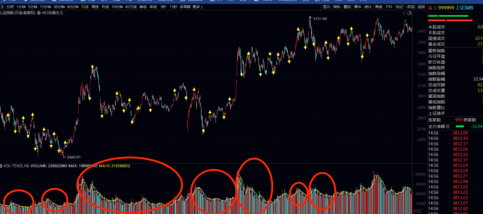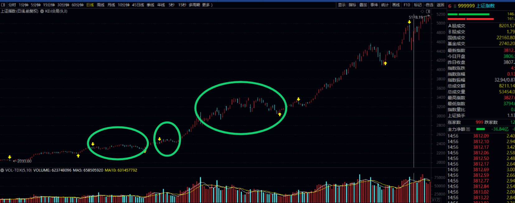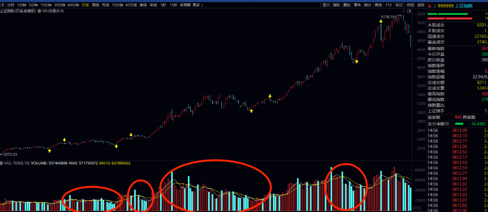 从3万亿天量回到2万亿,降了30%多的量就预示行情熄火?远的不说,2014-2015里这种降量的情况就比比皆是。以事实说话,下图中圈的哪一次不是降了30%以上,有的还降了73%以上,上证不还是从2千多涨到5千多点。这么明显的问题还有人赞同,都不思考一下的吗。 补一张2019-2021你跨出圈圈的那些地方,是不是都出现过中级调整。可能你也不知道啥是中级调整,在你眼里,只有牛市和熊市的区别