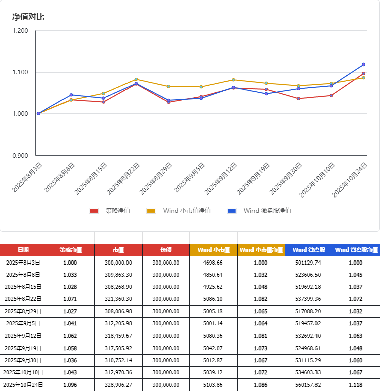 从 8 月份开始的小市值策略实盘,截止今天净值 1.058,同期万得小市值 1.073、万得微盘股 1.048本周主要靠有棵树涨停,净值超过了万得微盘股。只筛选 10 只,波动性比万得两个指数更大