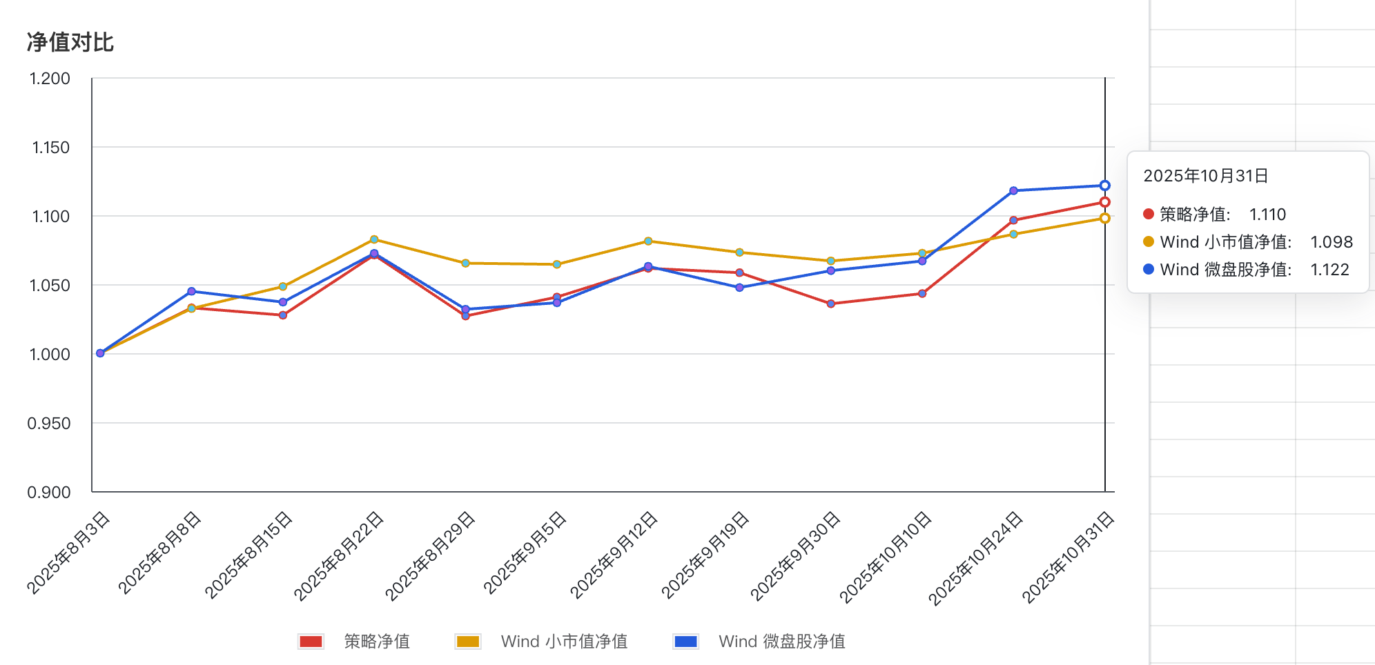 今年八月份开始,我的小市值策略开始实盘,业绩参考标的是万得小市值指数和万得微盘股指数。截止今天,正好三个月,收益率与参考标的基本一致。