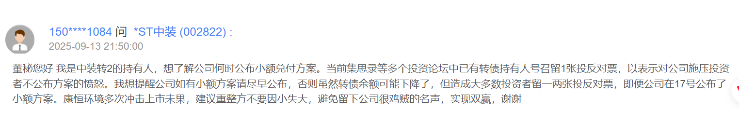已经在互动平台上向公司提问了,周一再给公司打个电话。康恒多次冲击上市未果,不至于为这点钱冒风险。对于转债投资人不利的因素是公司掌握了所有的转债持有人持仓情况,主动权在他们手上。不过几个账户加起来也只有几万块钱,中装整体上也有点盈利,我是不会转股的,陪公司看底牌,并且我到目前也觉得公司会有小额,看看结果咋样。