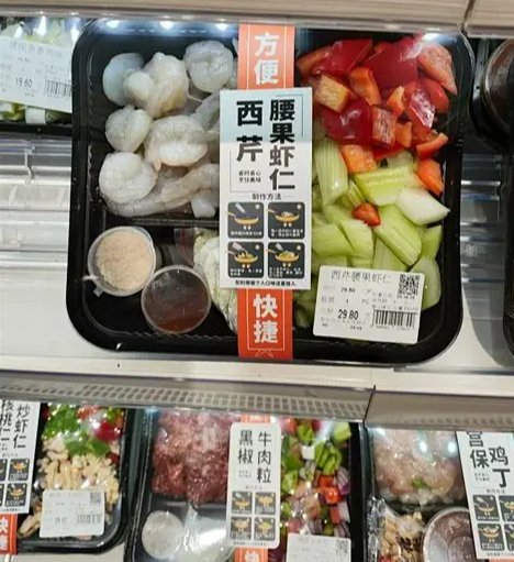 日本有一个概念叫“中食”,是有别于出外就餐的“外食”,以及传统的家庭做饭方式“内食”,中食产品是在家庭以外的调理食品厂加工完成的,消费者买回家后只需要简单的调理(不是简单加热,还是要放进锅里烹饪的),类似于胖东来卖的半成品菜。这种“净菜”超市很多的,保质期很短,只能冷藏,1到3天,跟西贝那种冷库拿出来的不一样的