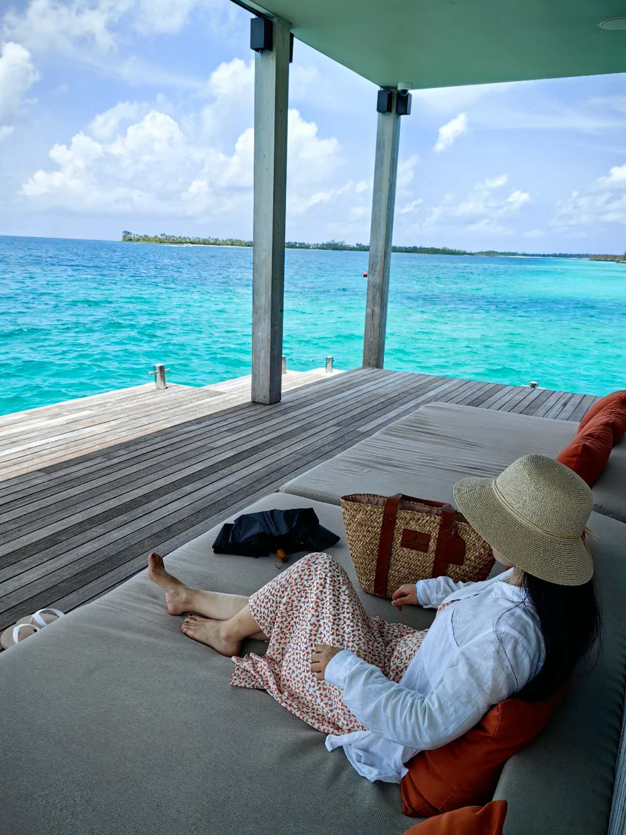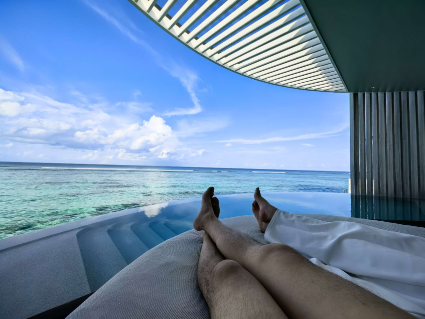 在马代不管是在房间里、沙滩上,还是码头边,到处都有躺床,主打一个“随处可躺、睁眼即景”,咱这种爱偷懒能躺着绝不坐着的懒人,简直太对胃口了。而且房间里能躺的地方,居然安排了好几个,简直把“躺平看风景”做到了极致。贴近海面的网床,早晚光线刚好,海风吹一吹,脚下就是轻轻晃动的海水,那种贴近自然的感觉,比在沙发上躺着舒服一百倍;泳池甲板上的大圆床,是防水速干材质,从泳池或者海里上来,身上湿漉漉的也能直接躺,不用特意擦,太省心;卧室里两米宽的大床,正对着大海,可惜自从服务员开夜床主动把老婆自带的床单被套换上,这床就成了她这种小洁癖的“限制范围”,除了晚上洗澡后的睡觉,白天压根不让阿凯往上躺,还好卧室侧面的餐桌旁还有一个小床,照样能躺能看海,也算没让太委屈。