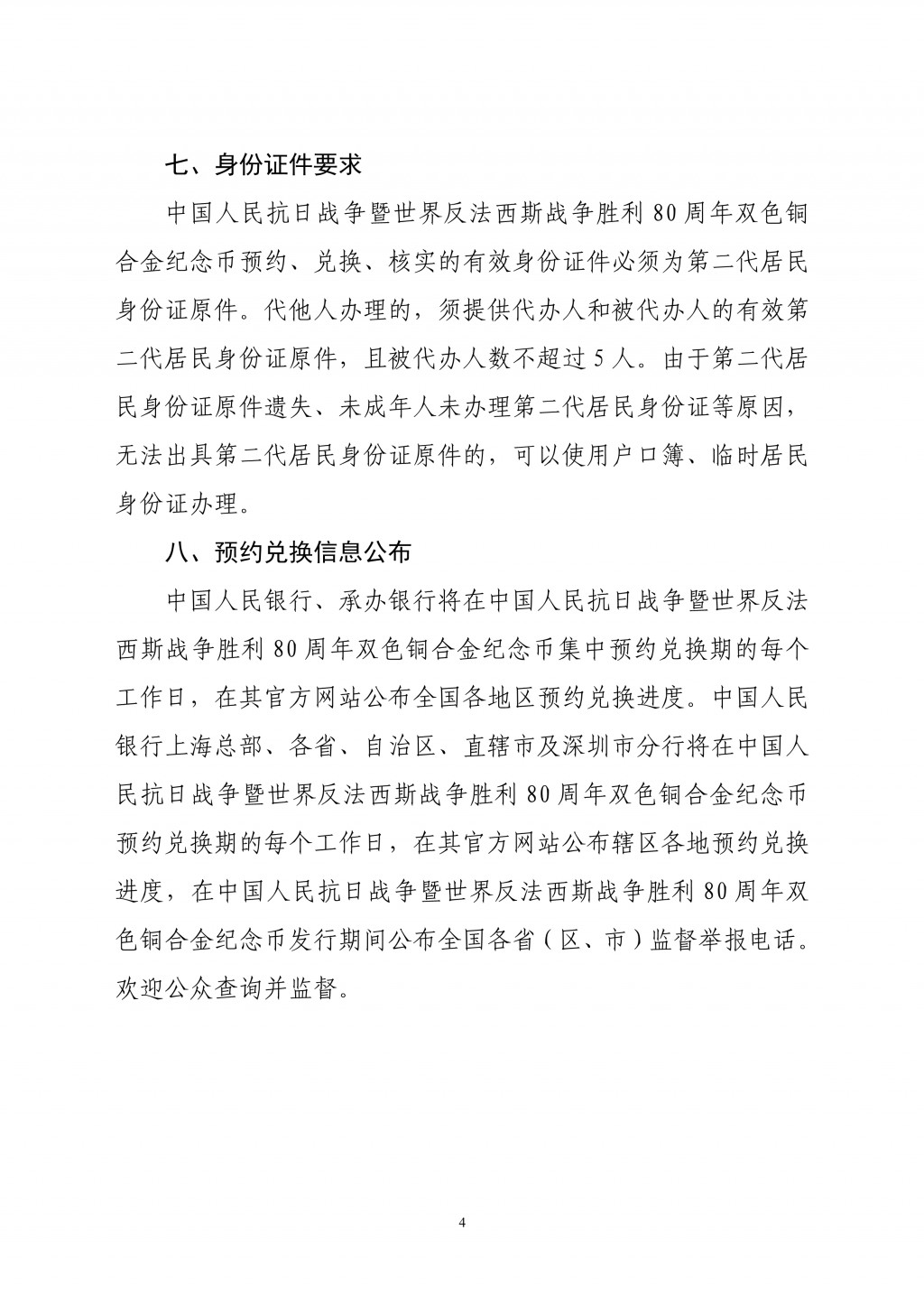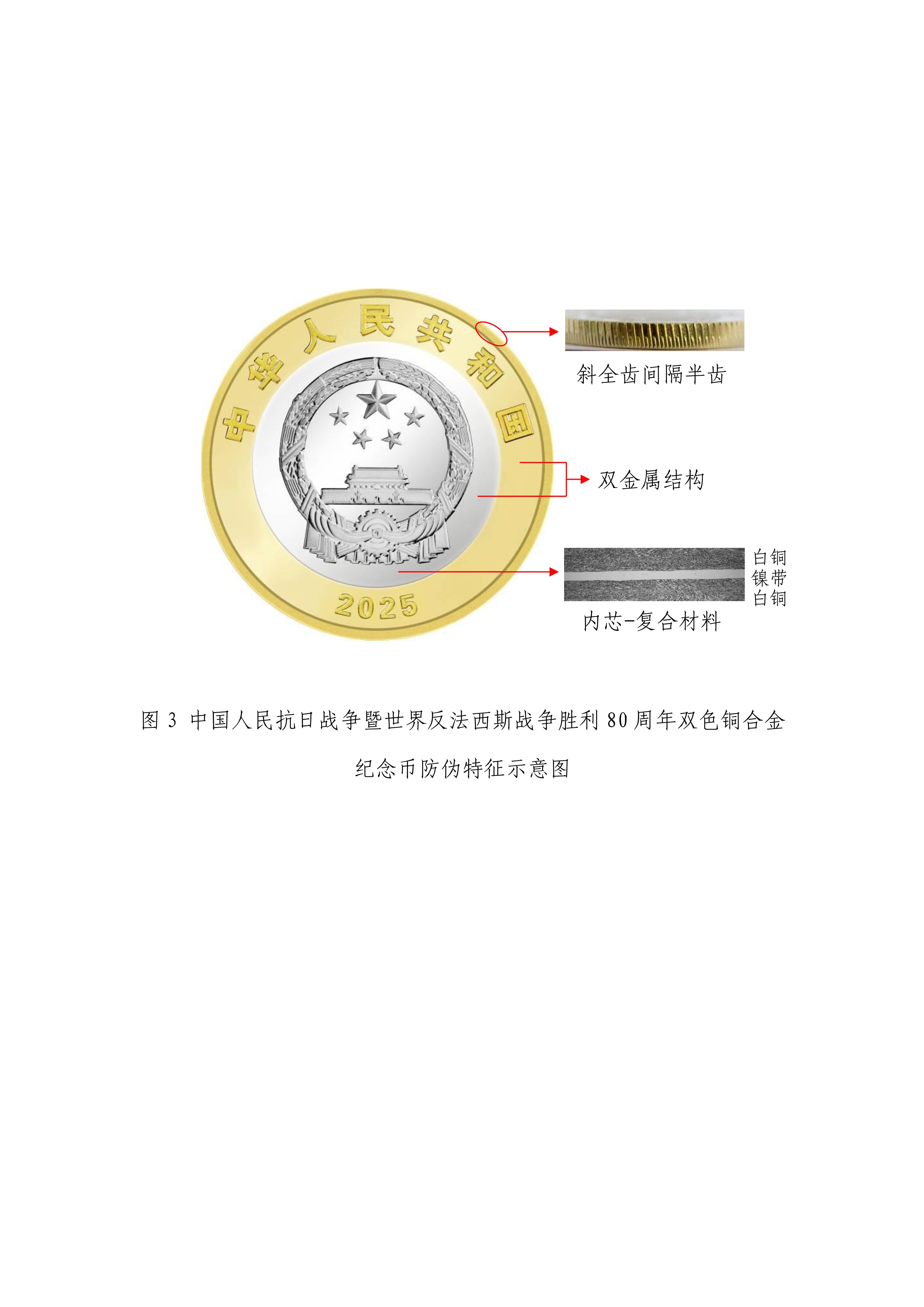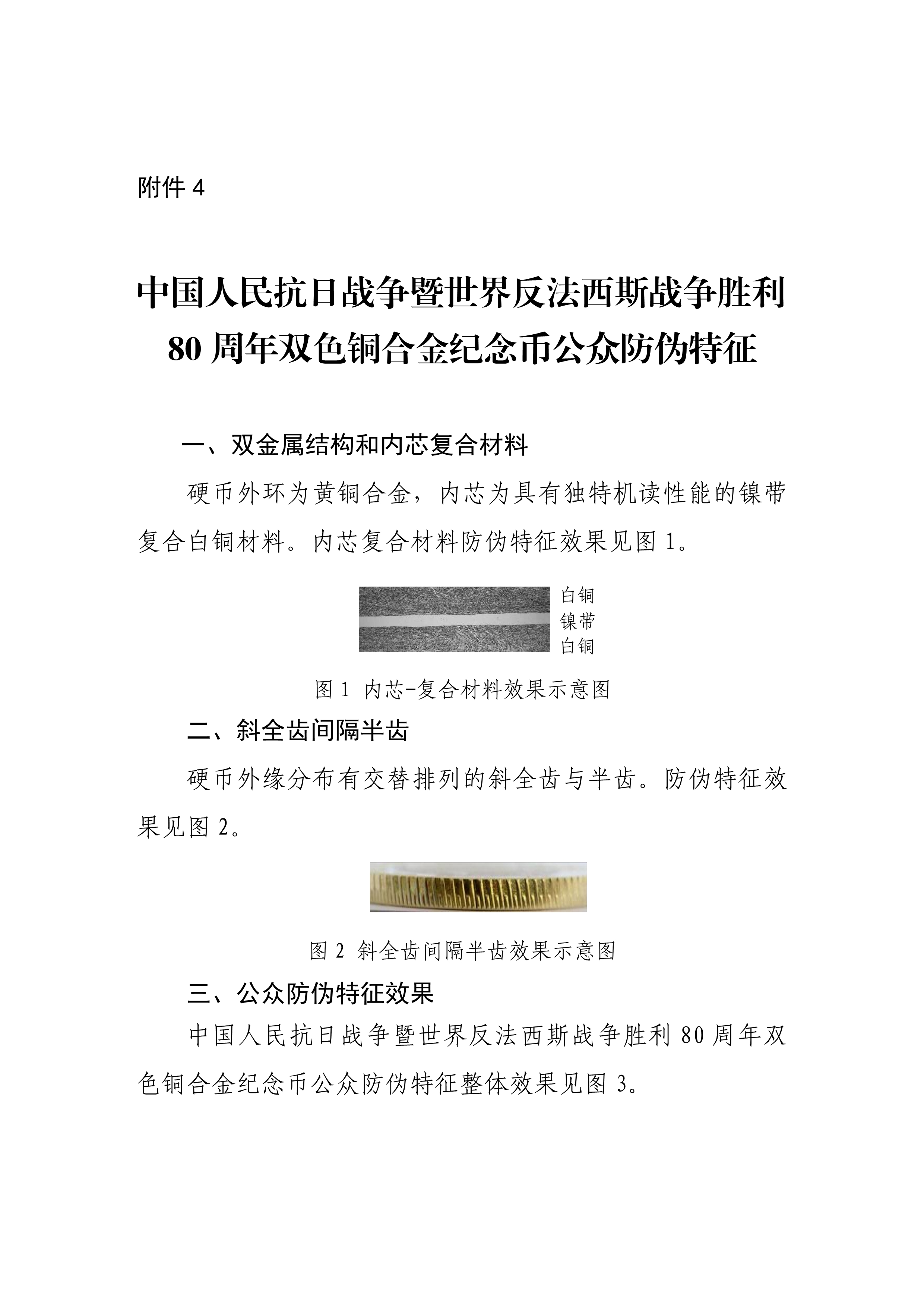 (四)中国人民抗日战争暨世界反法西斯战争胜利80周年双色铜合金纪念币公众防伪特征见附件4。