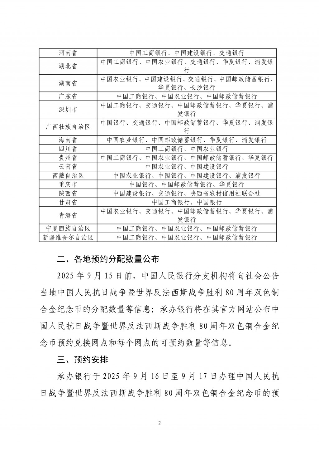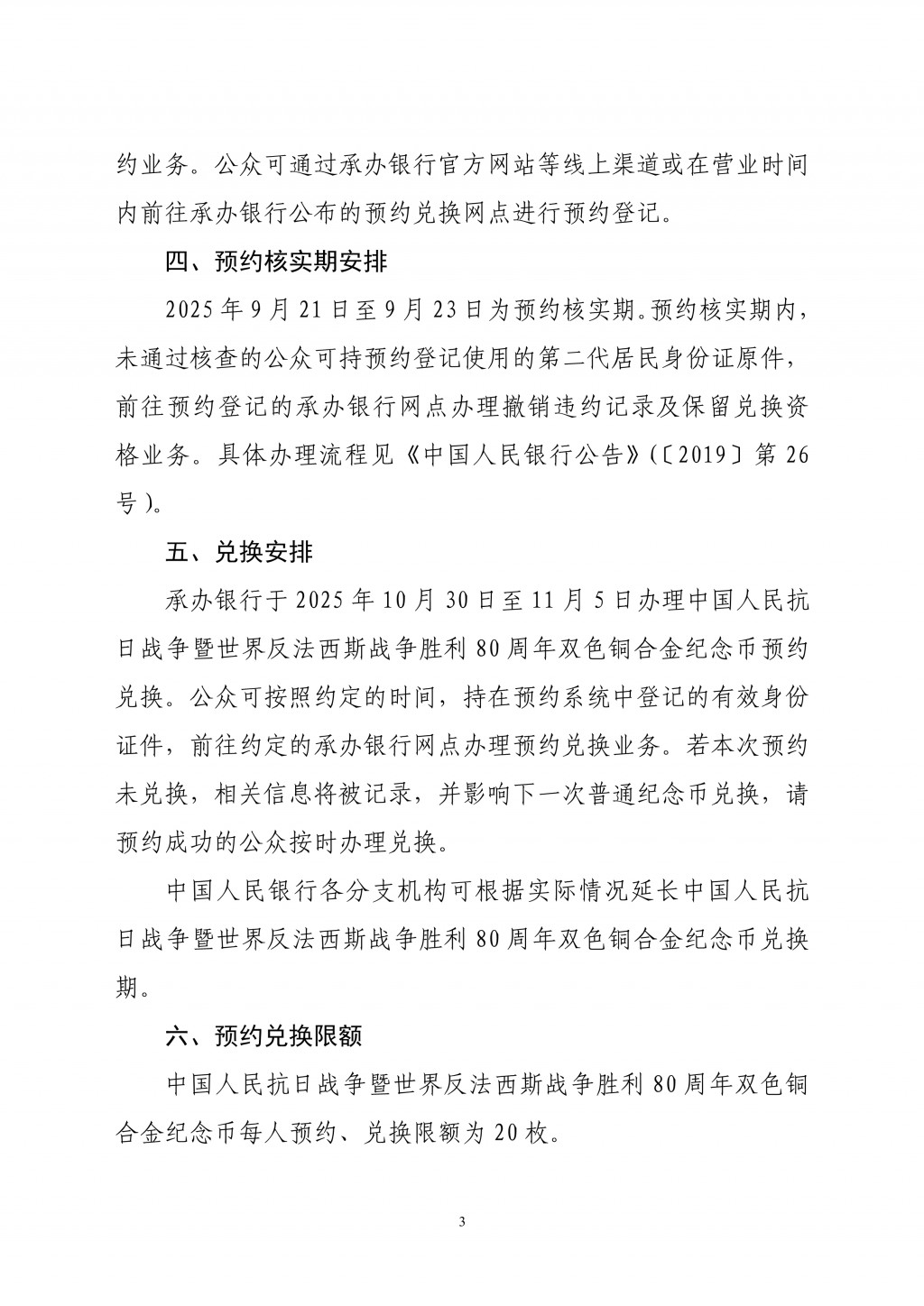 中国人民抗日战争暨世界反法西斯战争胜利80周年双色铜合金纪念币采取预约兑换方式发行。具体工作安排见附件3。