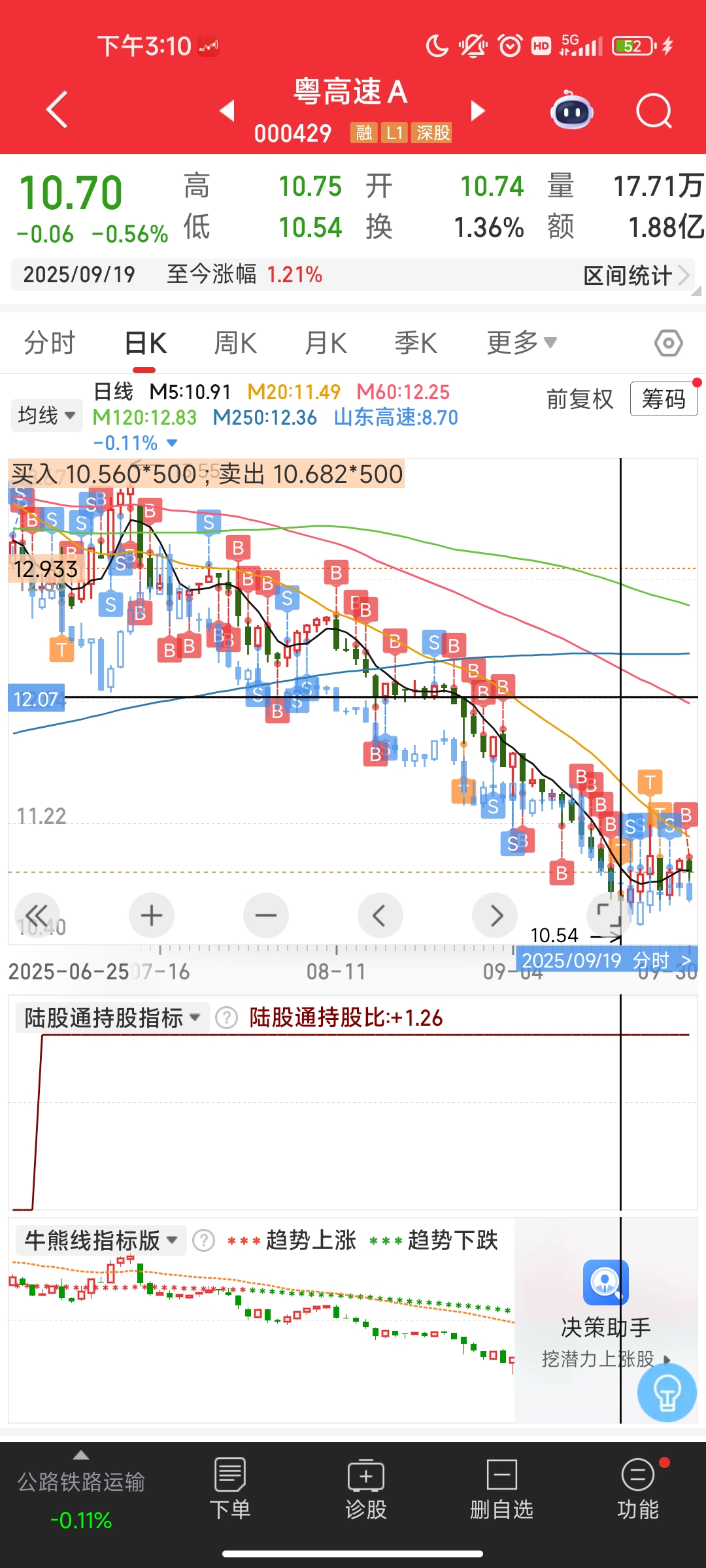 - 关键价位获得支撑:从日K线图可以看到,股价在近期多次下探到 10.40元 附近后,都没有有效跌破,这个位置形成了一个明显的支撑平台。图片中当前价10.70元,正是从10.40元附近支撑位反弹上来的结果。这是企稳最直观的信号。