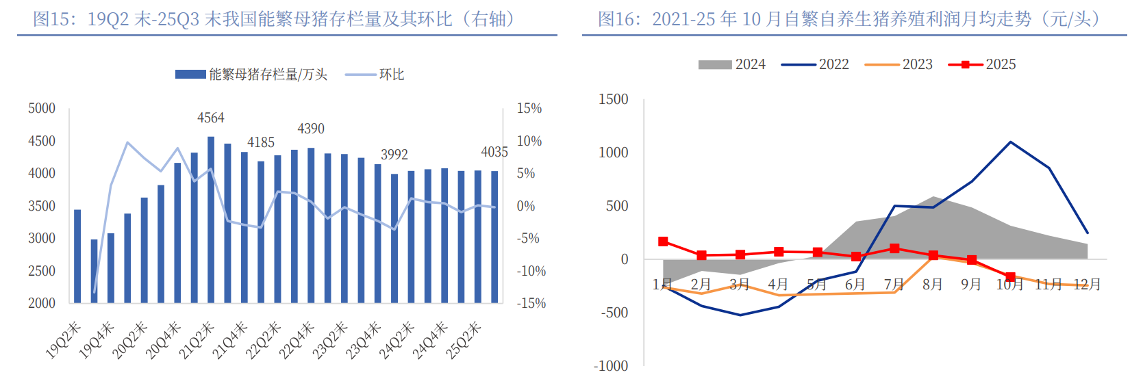 24 年 5 月以来生猪产能增加,其对应着25 年四季度及 26 年一季度供给继续增加,预计猪价压力仍大。