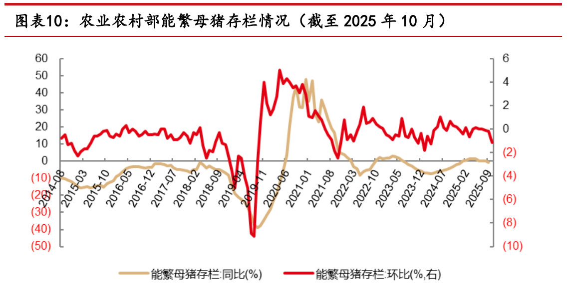 农业部公布 10 月能繁存栏为 3990 万头,环比 9 月下降 45 万头,降幅为 1.1%
