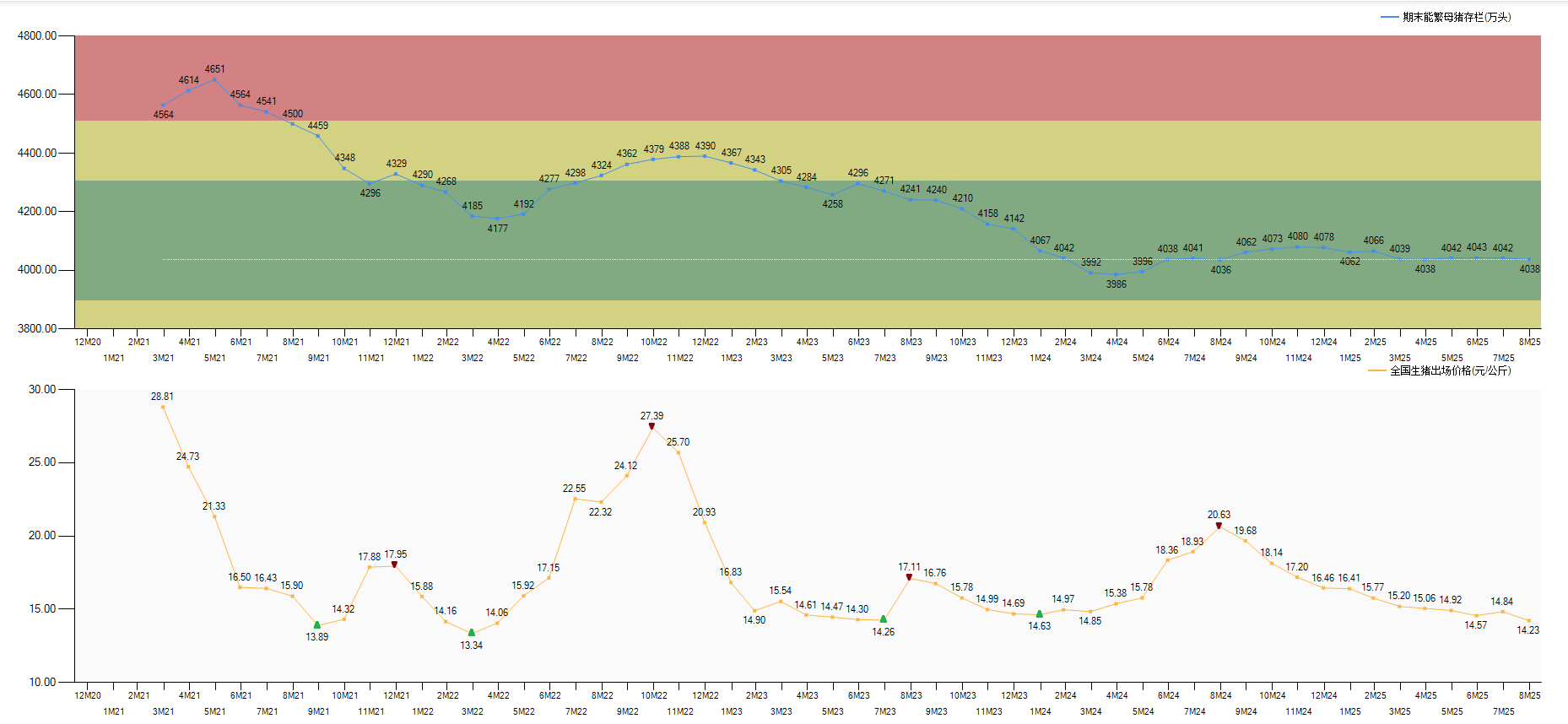 (前值-0.2%)。能繁母猪时隔 17 个月重回 4000 万头以下,母猪调减 100 万头的
