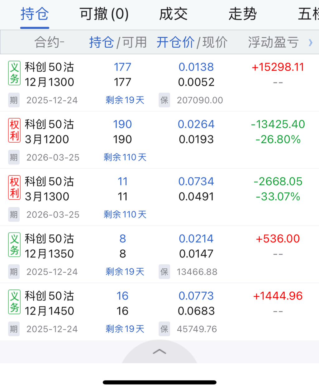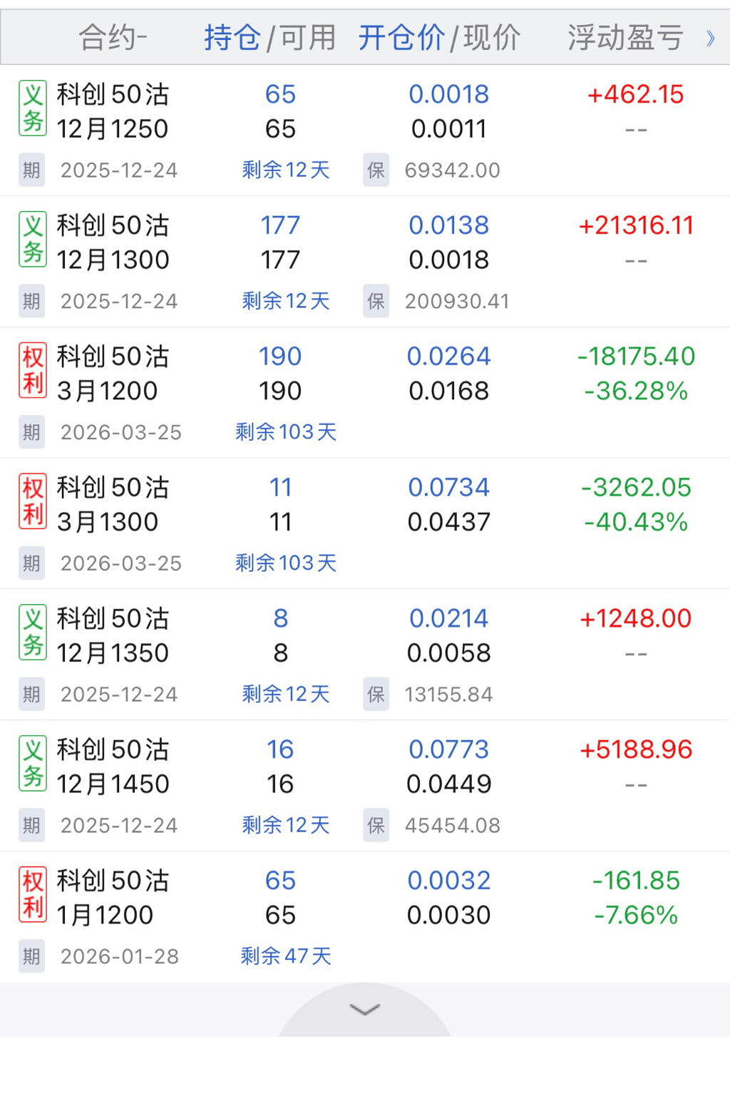 我用的科创1月1300配3月1250,delta略微偏正,本周未调仓,每组赚5元,这策略有点象读书时做实验,挺有趣的。你的组合12月的gamma值远近月相差太大,加上降波吃亏了。