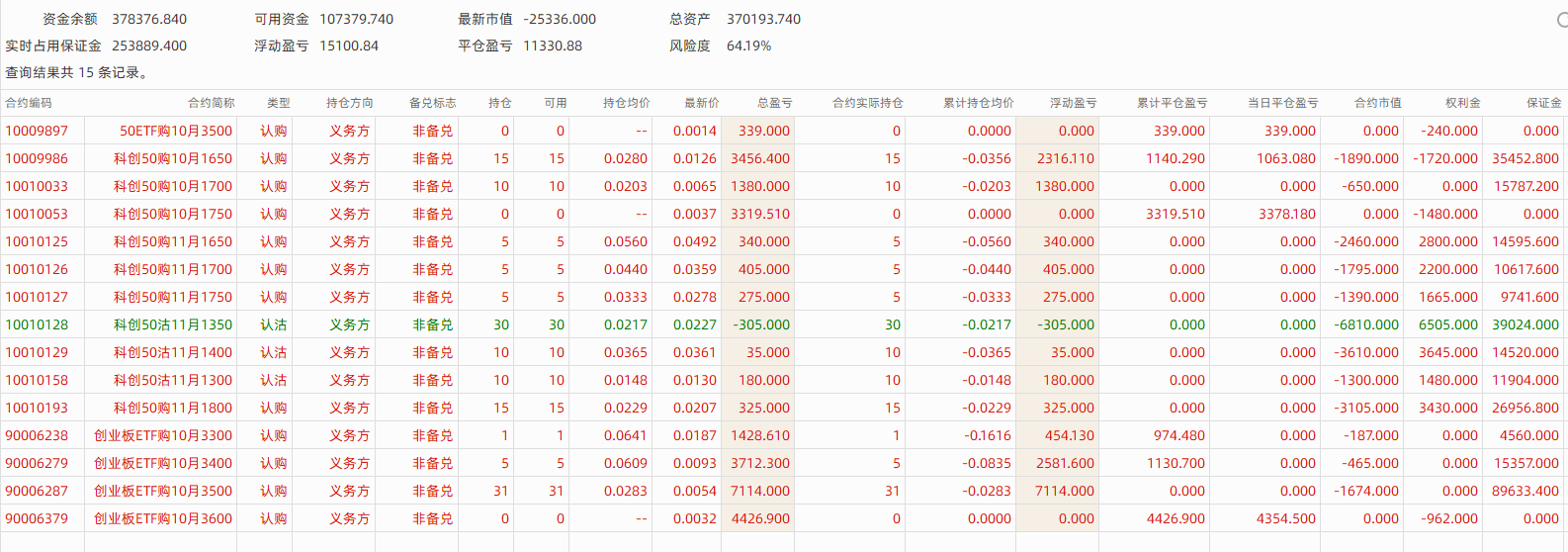 今日操作:尾盘完成两项调仓:一是将10月份部分期权合约换仓至11月份认购合约;二是加仓并新增部分11月份科创50 ETF认沽期权卖方仓位。