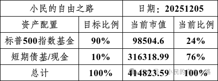 看对、做对、重仓做对之间存在鸿沟,是三种境界,我知道自己是在做对的事情,但是还没有做到敢于重仓。当前的权益仓位与目标仓位差距较大,待12月的一笔存单到期后差距更大,存单到期后计划跟着增量资金分批买入标普500ETF,平滑过渡至目标配置。