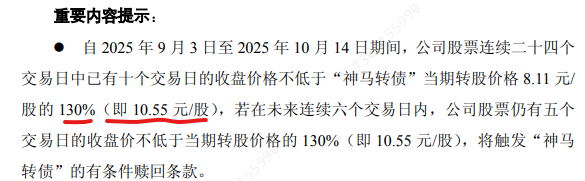自 2025 年 9 月 10 日至 2025 年 10 月 22 日期间,公司股票连续二十五个交易日中已有十个交易日的收盘价格不低于“神马转债”当期转股价格 8.11元/股的 130%(即 10.55 元/股),若在未来连续五个交易日内,公司股票仍有五个交易日的收盘价不低于当期转股价格的 130%(即 10.55 元/股),将触发“神马转债”的有条件赎回公告好像有点问题。连续4天应该就可以强赎。
