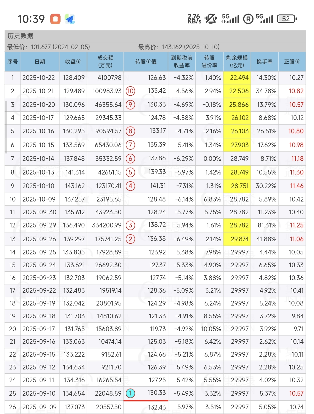 4. 9.25-10.9 转股价值2天高于130;