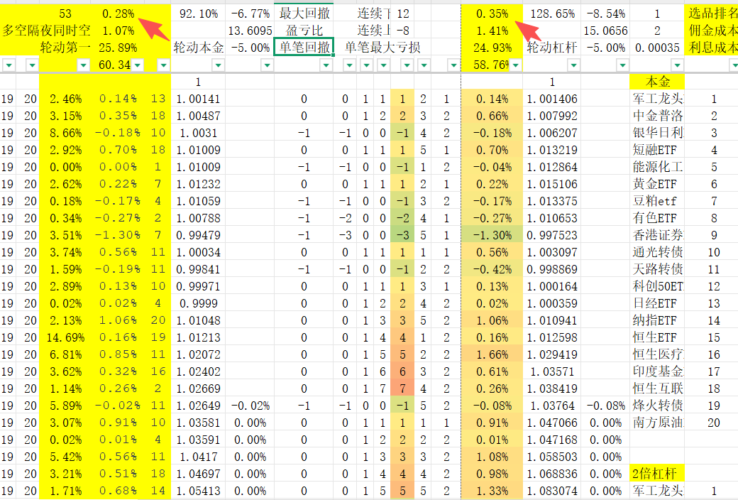 短线空仓很重要,这是数据回测的图片。频率20000次的基础上,高频交易+择时空仓后的每日单次回报率0.28%,年化92%,最大回撤-7%,单笔回撤-5%,连续亏损8天,连续挣钱12天,佣金万2,滑点万1,融资万3.5(=8.35年融资利率/242交易日)。仓位赢冲输缩,亏钱用本金,挣钱加杠杆,每日单次回报0.35%。高频交易的核心还是多空跟随板块+性价比选品+信号空仓+低成本+固定周期+固定买卖点...赞!------空仓是最好的防守,趋势是最好的进攻,0成本切入点是最好的买点。