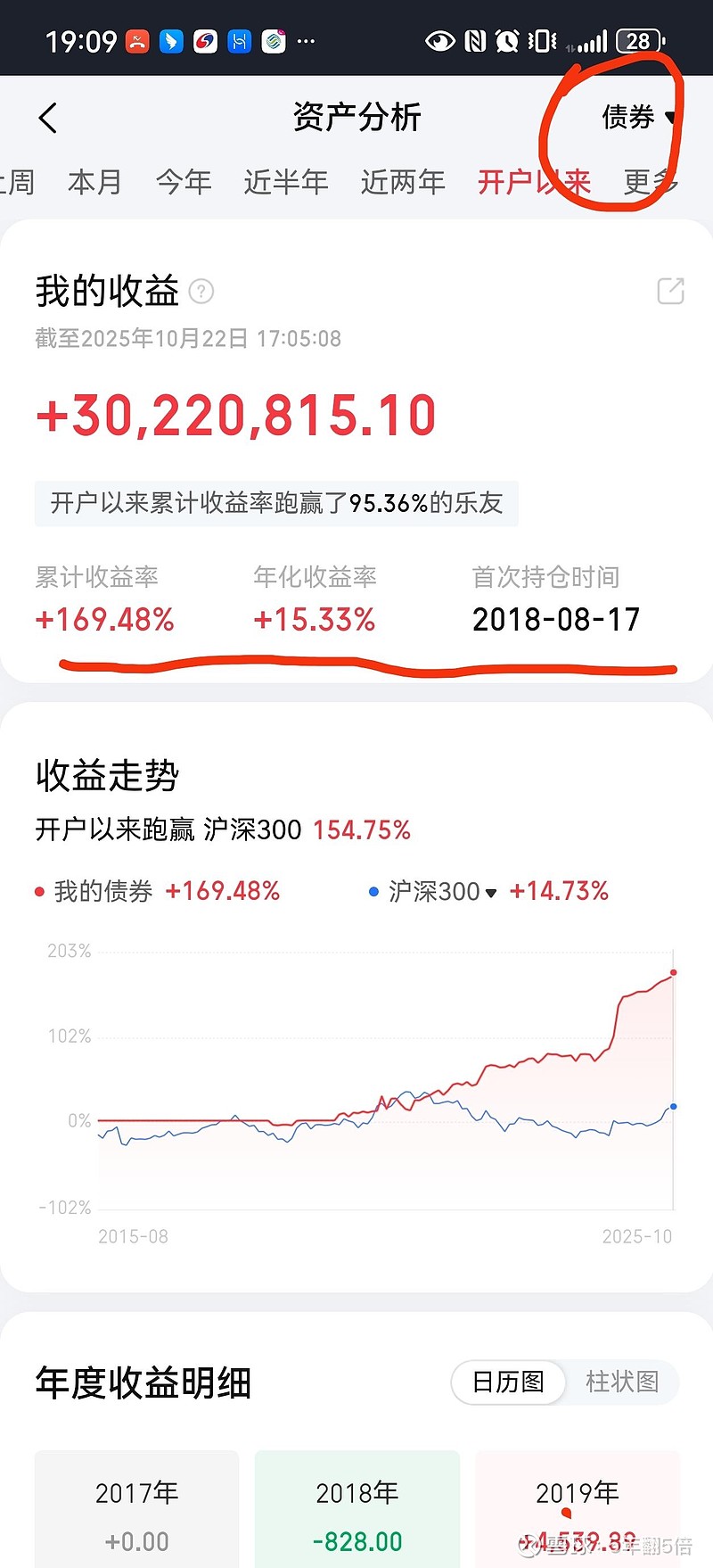话不多说先上图,昨天又是一个里程碑的日子,在可转债六年累计盈利超过3000万,发篇文章Mark 一下吧,这个收益统计只是债券的 不含股票,目前收益3022W。收益率我觉得统计的没那么准,实际应该比这个高,但我也没法算了 资金进进出出太多了
