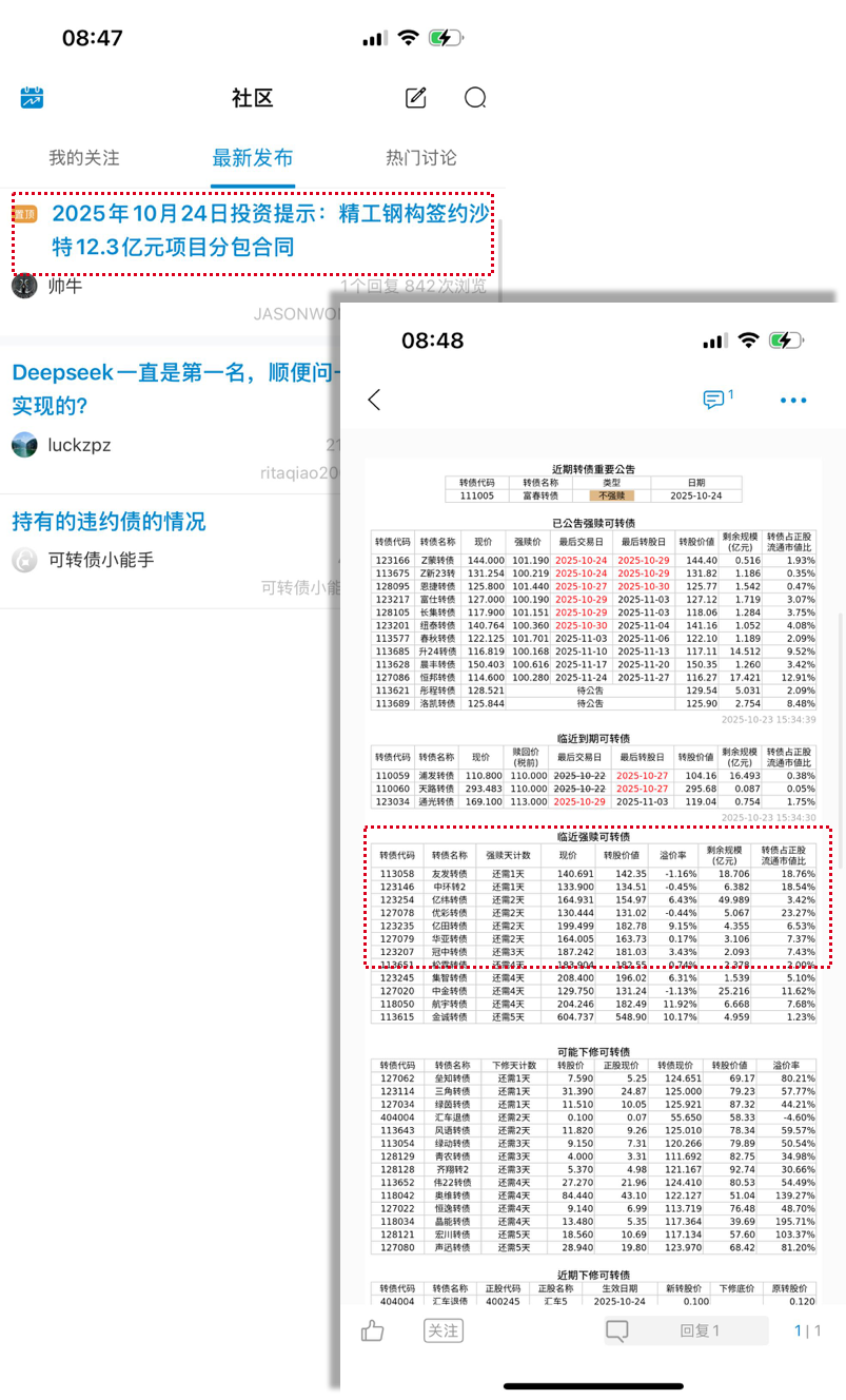 可以每天来看一眼投资提示,里面有临近强赎和临近下修的,看看有没有自己相关的。从置顶头条进去,每天都有表格显示。