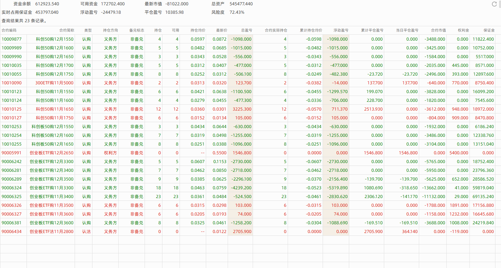 2. 期权账户:因持仓均为科创板、科创50及创业板ETF的认购期权卖方,受标的连续上涨影响,今日亏损1.6万-1.7万元,已连续两日回撤。