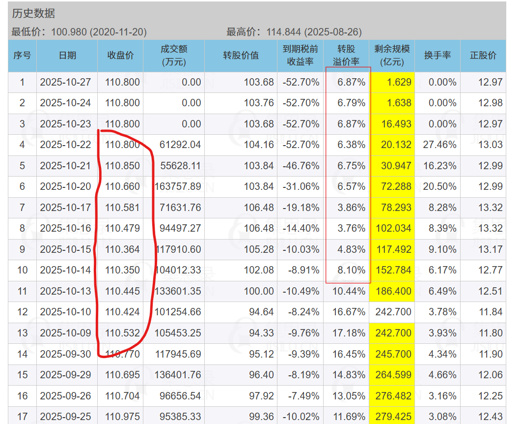 到期前最后几天,转债价格撑在110.8元,那么持有浦发转债理智的人都会选择按照110.8卖出而不是等待110元兑付