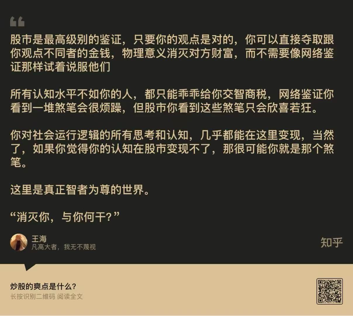 你错了 兄弟 完全可以又爽 又赚钱 比如转债大饼 比如网格(当然 网格不怎么赚钱)咱在说两个事,都没错。你在说应然,我在说实然。你在说希望和正确的方向,我在说大部分人的现状。