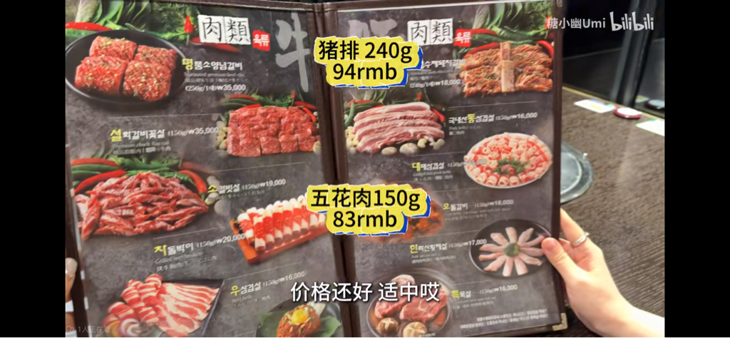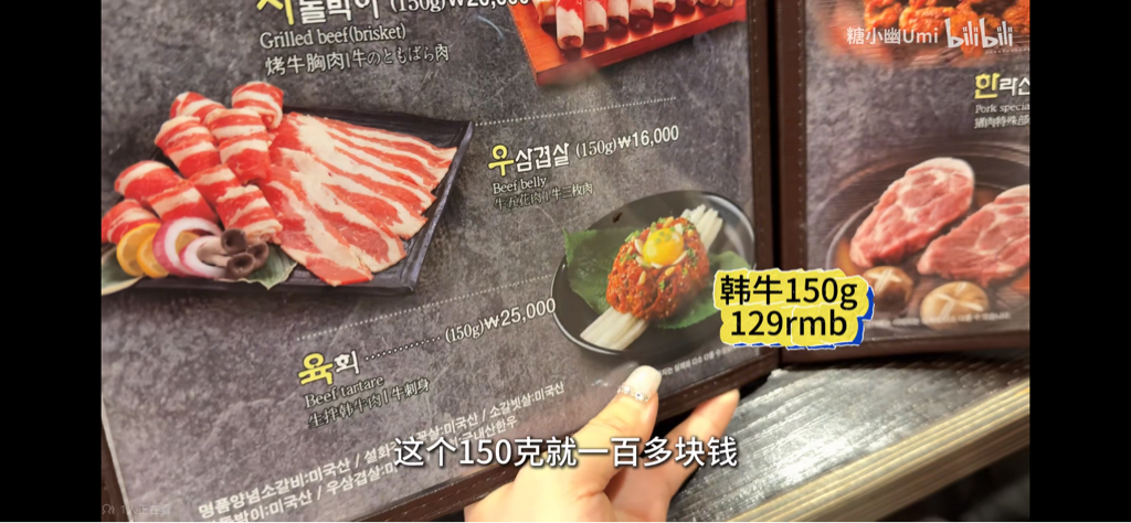 汇率错觉:看到标价“1万韩元”(约54元),误以为很便宜,但没意识到这只是200克肉的价格。