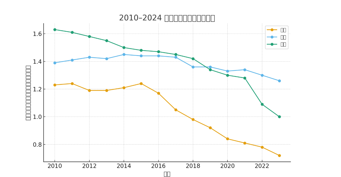 所以又稍做一点功课,原来韩国是典型的财阀寡头经济,韩国人的财富只是被平均了而已。而日本在富裕起来的时候积累了大量的公共资源,比如养老金和基础设施。而且日本经过20年的通缩,已经允许人们“平庸的活着”。而韩国人还在疯狂内卷,真正的人肉干电池。当然代价也是有的,下图是东亚三国的生育率曲线。你能猜出谁是谁吗?