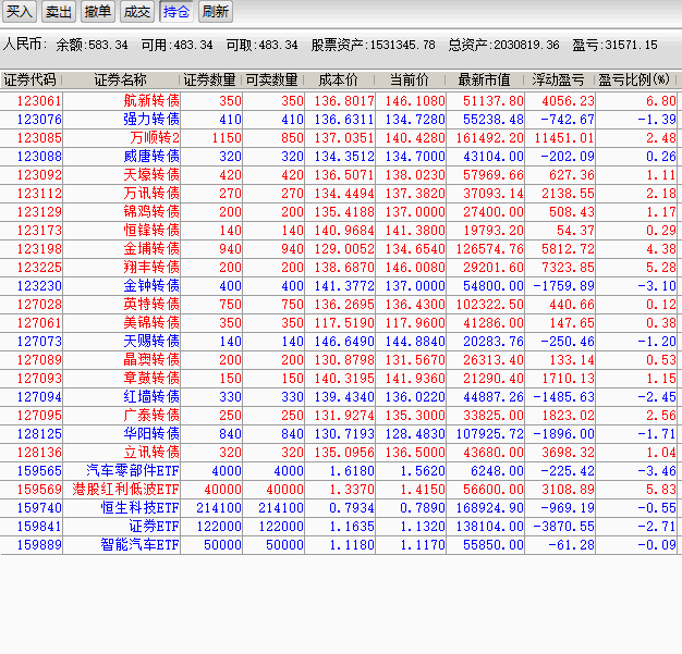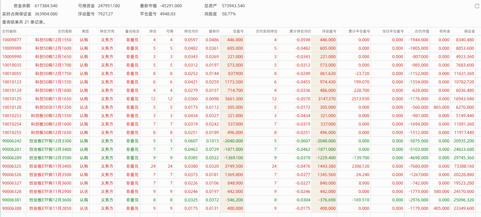 期权方面,今日账户创历史新高至57.4万元,相较于48万元本金,盈利9.4万元,过去两个月累计收益近20%,月均收益超10%。这一收益主要得益于过去一个多月高波动率及波动率由高切低的有利行情,且在创业板急速上涨后,成功顶住市场回调压力(创业板、科创板同步回调)。后续将持续研究并优化期权交易策略,希望通过可转债、ETF与期权的组合配置,实现稳健可观的整体收益。