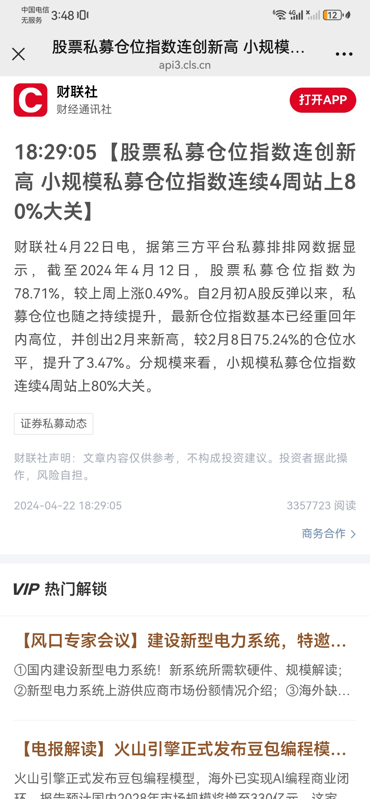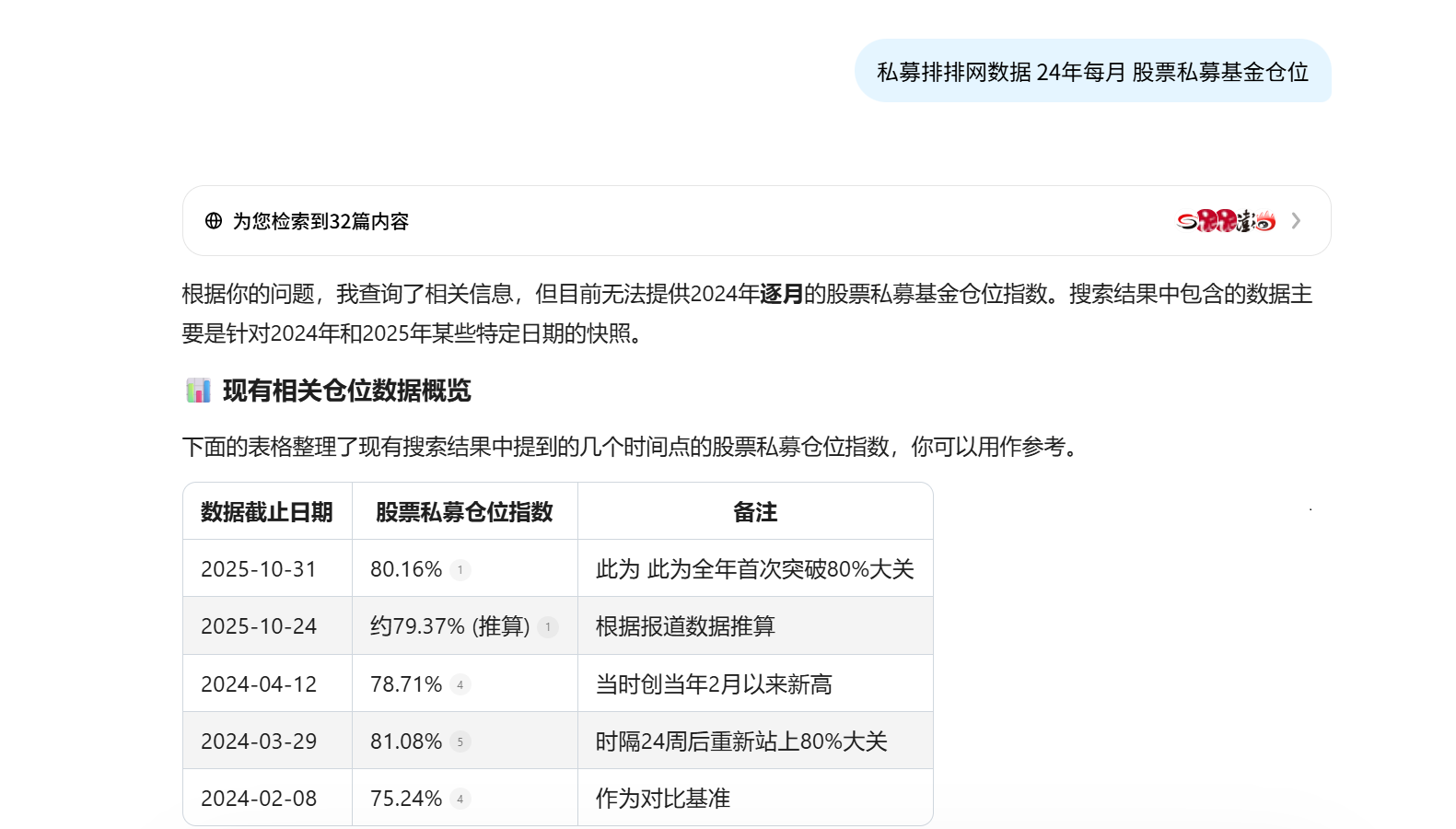 https://finance.sina.com.cn/roll/2024-04-10/doc-inariuys2018534.shtml因为我也是一个个新闻链接核实下来,并没有偷懒去用Ai,这是2024年3月份的数据,平均仓位是77.12%