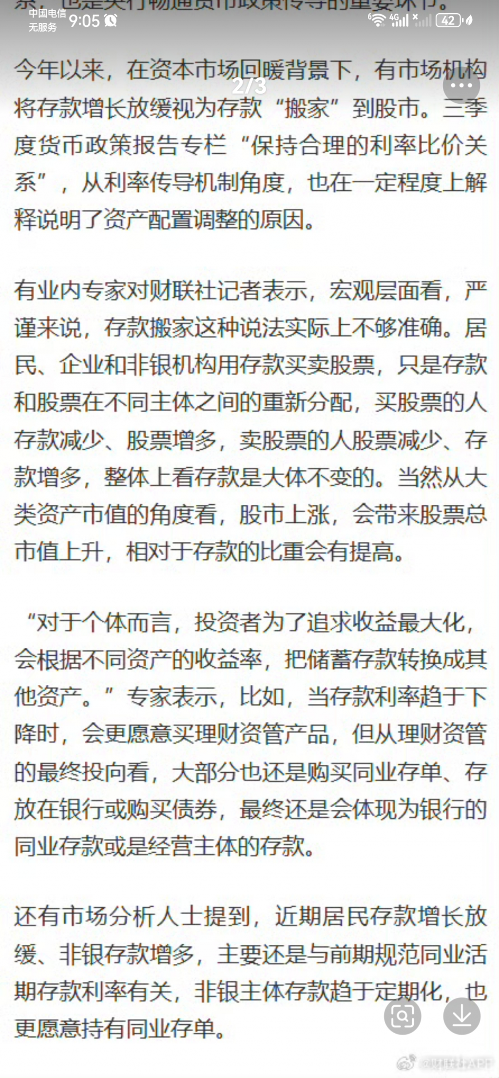 还有一种说法,确实发生了存款搬家,只不过是你存款搬到证券市场,然后大小非从证券市场搬到银行,君不见九月份存款又增加了。大家在A股市场浸泡多年,这里面的欺诈都心知肚明,没必要装外宾了。