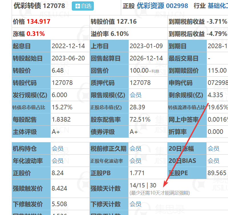 优彩转债的强赎天数集思录的数据是不是算错了,9月22日至今天共30个交易日,转股价的130%为8.424元,近连续30个交易日已经满足大于8.424元的已经有14个交易日(不算今天)了。