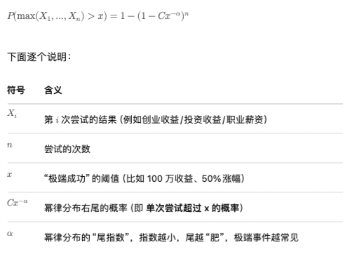 成功不是看你第一次选择什么,而是看你能尝试多少次。医生属于正态分布,稳定但上限有限;创业属于幂律分布,低概率但可能暴击。尝试次数少的人应该选正态分布的路径;能多次尝试的人才能去赌幂律长尾的极端成功。职业、创业、投资都是同一个道理——分布决定机会,尝试次数决定命运。
