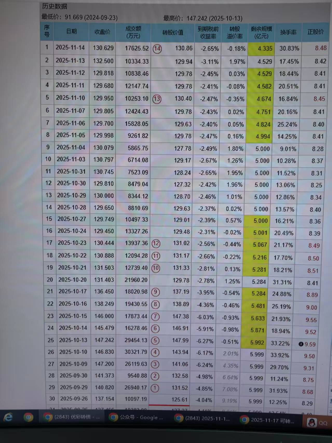 转债指数从前年2月13日2090跌至去年2月5日1753。再到当下2517, 现中位数134,温度90.58度,130元以上转债250个,比前日多8个,占比62.5%;低于110元5个,比前日少1个,价格创最低0/高12,11月转债5绿5红。可转债成交723亿,比前交易日少82亿,换手率13.17%,下至700亿第1天。转债指数跌17点,至2517点 ,平均价149.3,比前日低1.2,中位数溢价27.6%,比前日低0.1,A股成交19805亿,比前日少800亿。昨日平开平走,午后一路东南,中幅下跌,转债指数高位,转债情绪温度保持较高位;今日计划 有T做T 保持仓位;