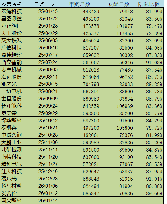 账户占比高,资金量占比不大,从公布中签率和实际中签率倒推,陪跑资金占比约20%一个新股如果门槛300w的话,那么250-300w的申购其实是理性的,这部分可能占陪跑资金一半吧。所以真实的毫无胜算的资金量也就10%左右。