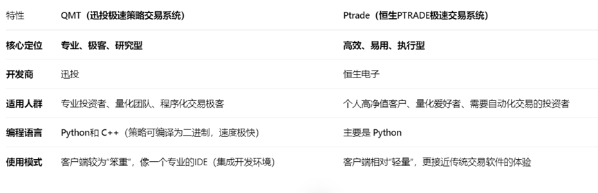 Ptrade: 更像一个“面向广大投资者的量化策略执行工具”,注重策略的快速实现、回测和高效执行,上手更容易,更适合广大个人投资者和量化爱好者。