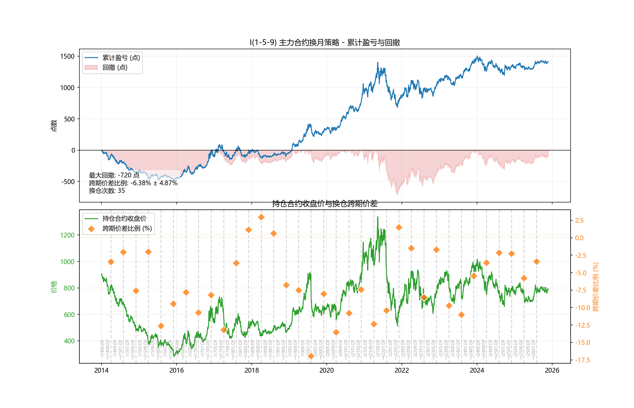 上图:我模拟长期持有一手铁矿石主力期货(1,5,9月份合约),在合约月份的上一个月第一个交易日换仓。未考虑手续费和交易滑点。