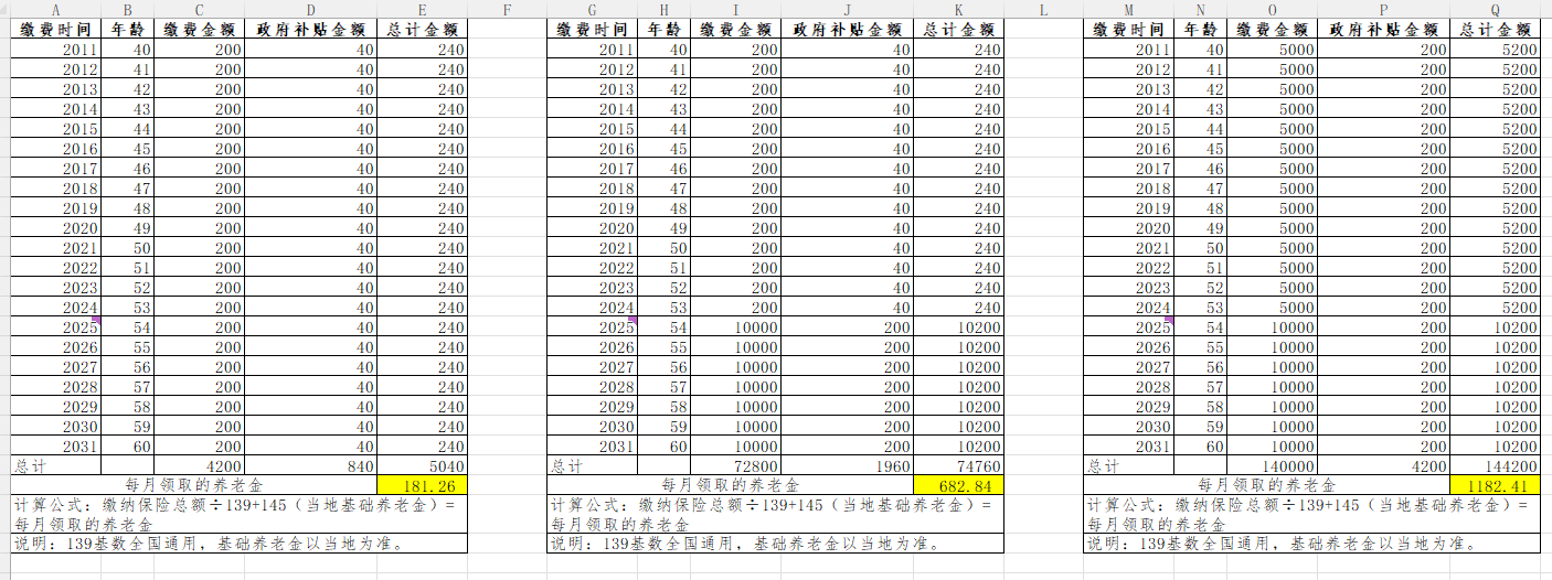 另外也计算了下,如果一直200元缴纳的话,60岁后每月只能领取181.26元;如果一直顶格缴纳+资助的话,60岁后每月可领取1182.41元。相差1000元!