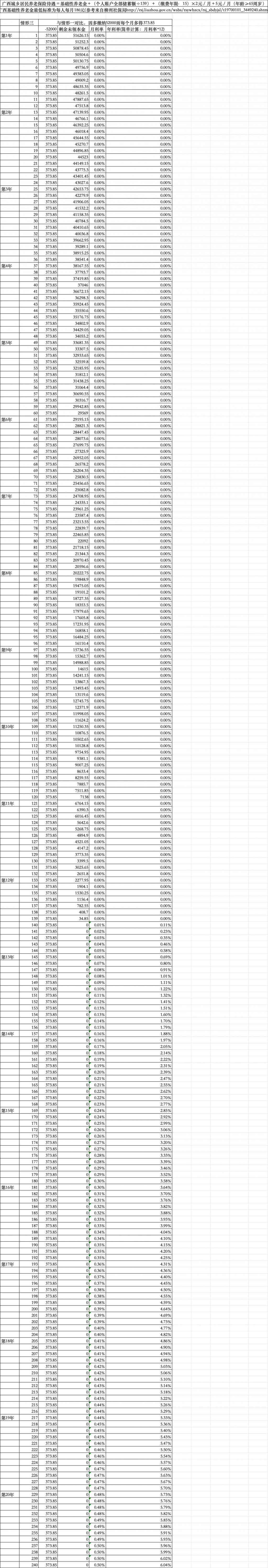 每年最高档相比 200 元档总计多缴纳的52000从而带来每月多领的373.85元养老金,在这多缴纳的 52000 和每月多领的 373.85 之间去算年化收益率
