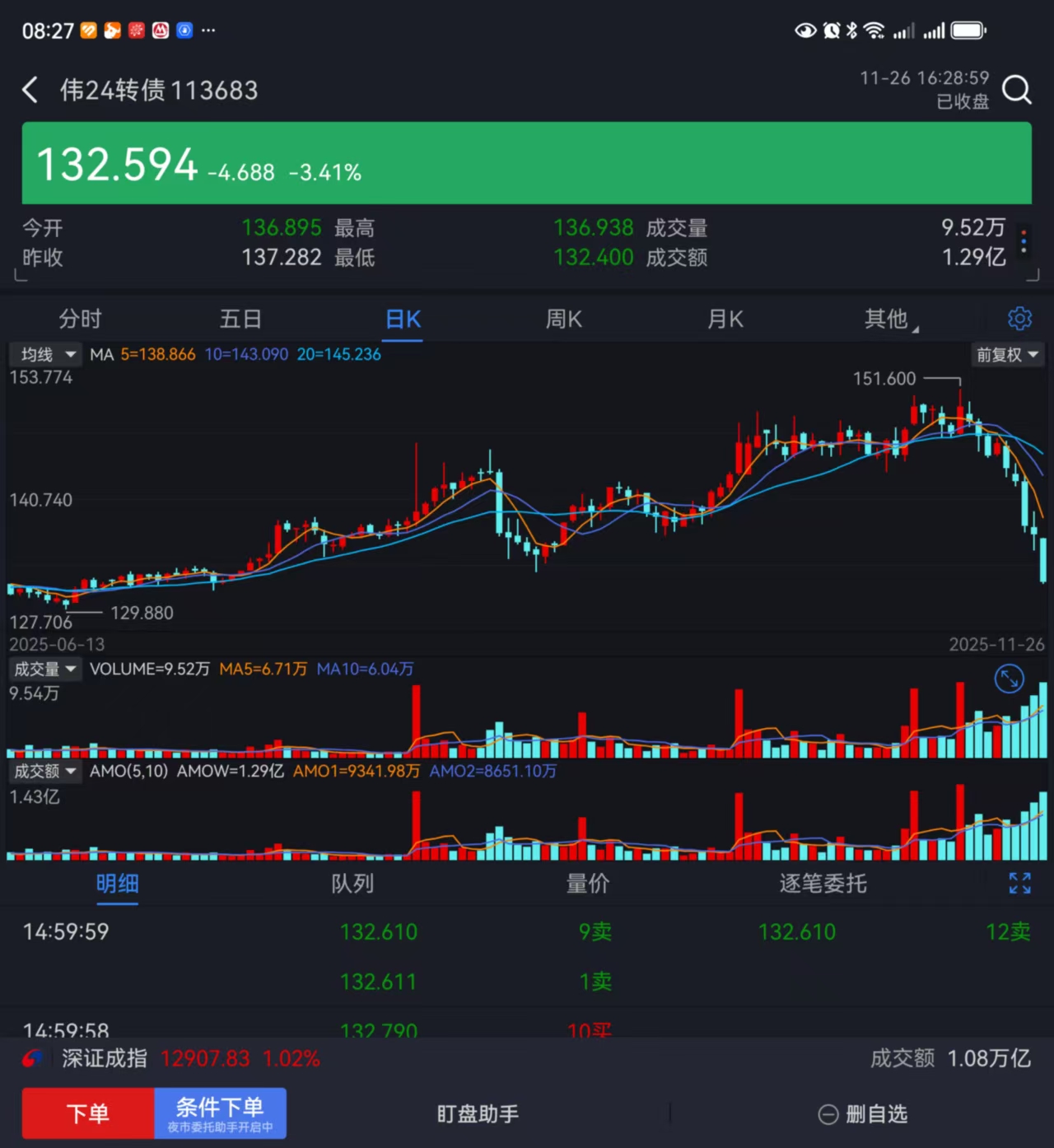 转债指数从前年2月13日2090跌至去年2月5日1753。再到当下2468, 现中位数131.2,温度85.2度,130元以上转债214个,比前日少13个,占比53.9%;低于110元10个,比前日多1个,价格创最低0/高3;11月转债10绿8红。可转债成交581亿,比前交易日少96亿,换手率10.7%,下至500亿第1天。转债指数跌22点,至2468点 ,平均价146.8,比前日低1.4,中位数溢价32.1%,比前日低2.4,A股成交17974亿,比前日少300亿。昨日平开低走,午后一路东南,大幅下跌,转债指数高位,转债情绪温度保持较高位;今日计划 有T做T 保持仓位;