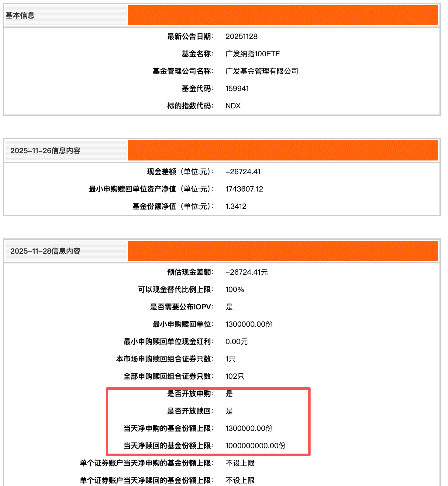 我来给个标准答案吧,虽然你看到的是开放申购,但是实际上有qdii额度的限制,纳指的etf基金每日都有申购总量上限的限制,比如广发的这个溢价8%,每天申购下限和上限都是130w的额度,等于每天只能有一个投资者能申购成功