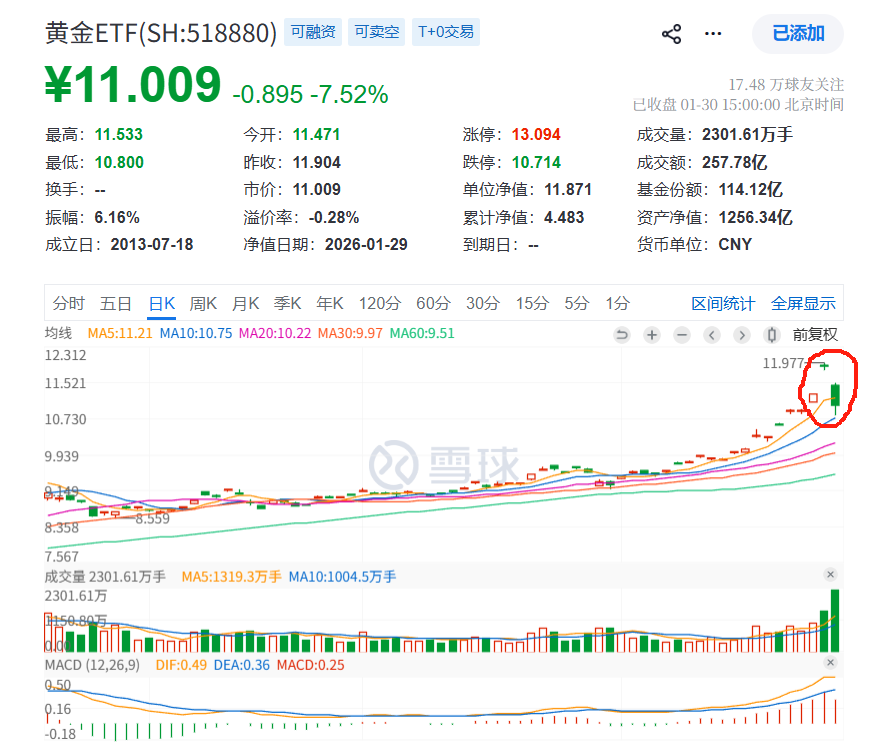 本月经历最大的过山车是黄金ETF,29日,开开心心涨5.53%;30日大跌7.52%,放量长阴包阳,从技术形态上看,后面应该看跌;但前期涨得太快,策略仍需持有。在卖与不卖之间纠结。