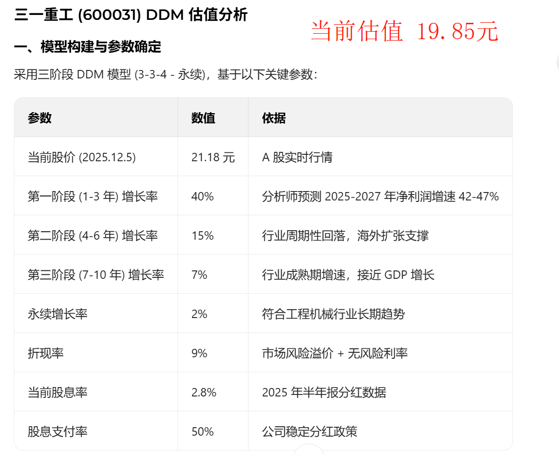 按照下面的条件进行DDM估值,合理估值19.81元。当前价格21.18元,已经充分体现了对未来业绩的预期(未来三年净利润年化增长40%,未来4-6年年增15%,未来7-10年年增7%)。