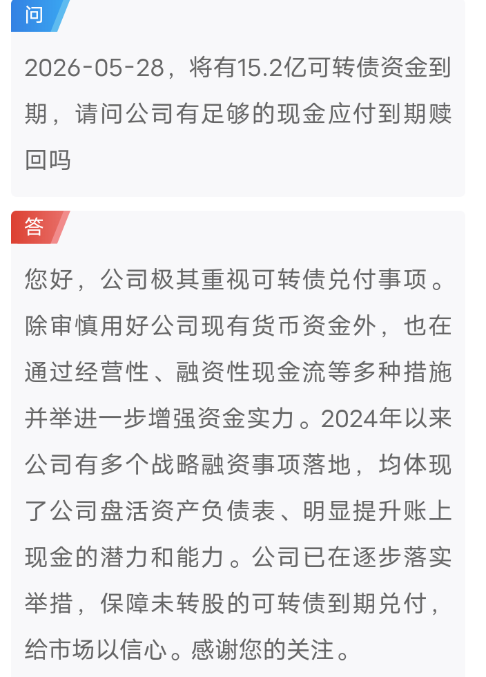 既然公司都是一分钱式下修,想必公司也是有信心有资金去偿付的。另一方面公司的资产负债率马马虎虎,属于中等水平,但据不属于高风险水平,资债率例如宏图、希望、乔银、紫银就属于高风险水平。对赌回购的本金及利息,可以参考2024年度报告-长期应付款-回购义务本金及利息总计10.77亿,公司表内已计提体现,不存在表外未计提的风险。108赎回价是底线,考虑到机构不扣税最后一天的价格大致就在107.9左右。今日...大哥你多学学财务知识,看公司有没有偿还能力不是光看负债率的啊,公司大多数现金都在子公司上绝对动不了的,一年内到期的债务40多亿,15亿可转债,10亿多兑付赌的本息,还有银行贷款,兑赌的本息据说准备跟投资方谈展期,那剩下16亿可转债的钱从哪里来啊?这货大概率走的是山鹰的路子,最后下修打底然后转债跌到80多,找第三方接盘转股解决,你还敢继续加仓么,你说的宏图都比这个风险小,人家还有还几年,还有机会转股解决。另外他们每次5毛下修就是怕触发回售没有空间下修,总的来说就是没有钱