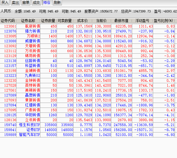 近期干啥也难赚钱..........转债退下来300个,搞点ETF基本没赚........搞点ETF期权也基本只赚了相当于银行利息.......一口气转到期货200个,赔了5万多.......干脆转回来做逆回购省点心.....................