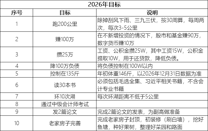 痛定思痛,下决心开始攒钱。2026年开始,工资单独拎出来,坚决不投入股市,独立核算,力争每年攒15万,房贷用公积金冲抵,不然真的看不到钱去哪里了。同时,大额支出开始记账,每年年底汇总统计,让自己的钱花的明明白白。已经40了,希望收入能够继续稳定下去,20年时间,攒300来万的现金,不乱折腾,就当是退休金吧。