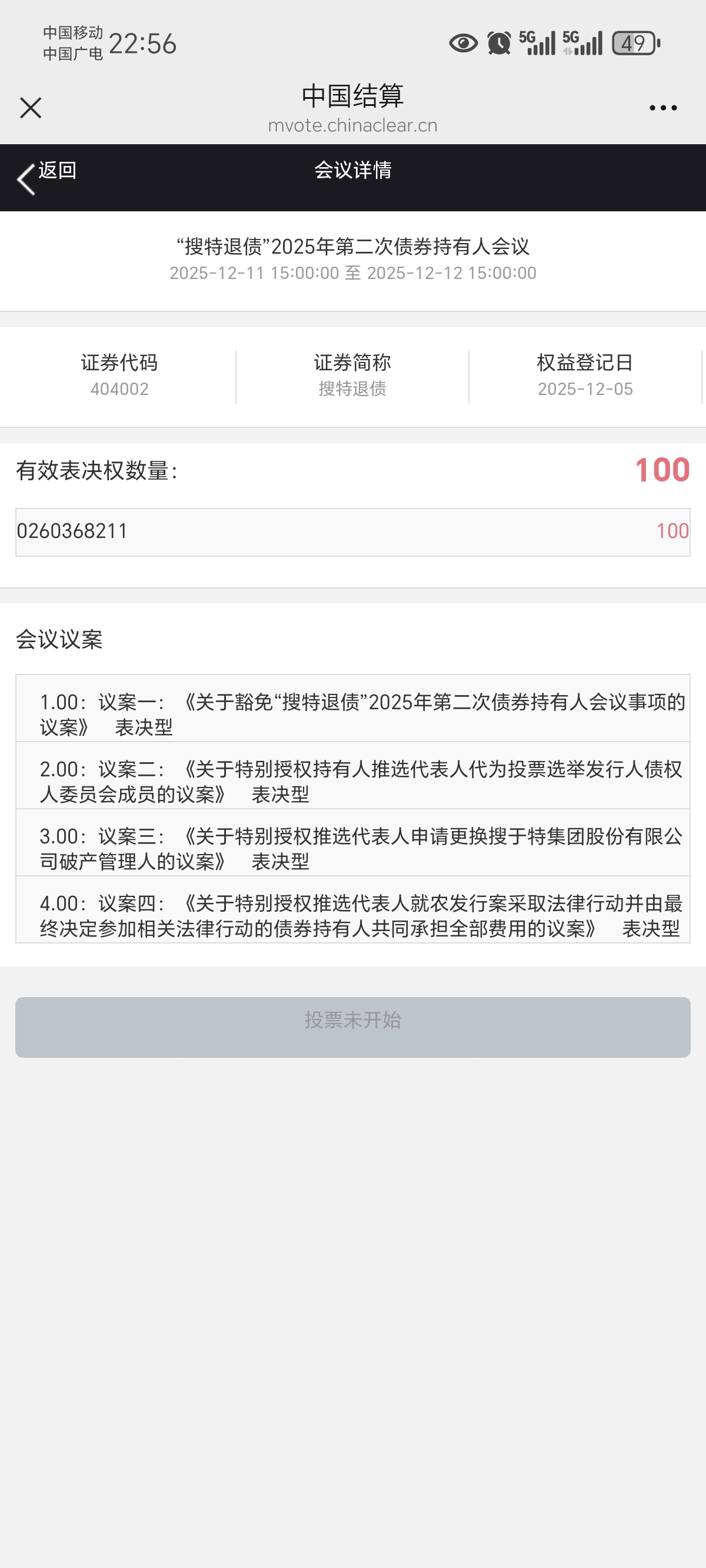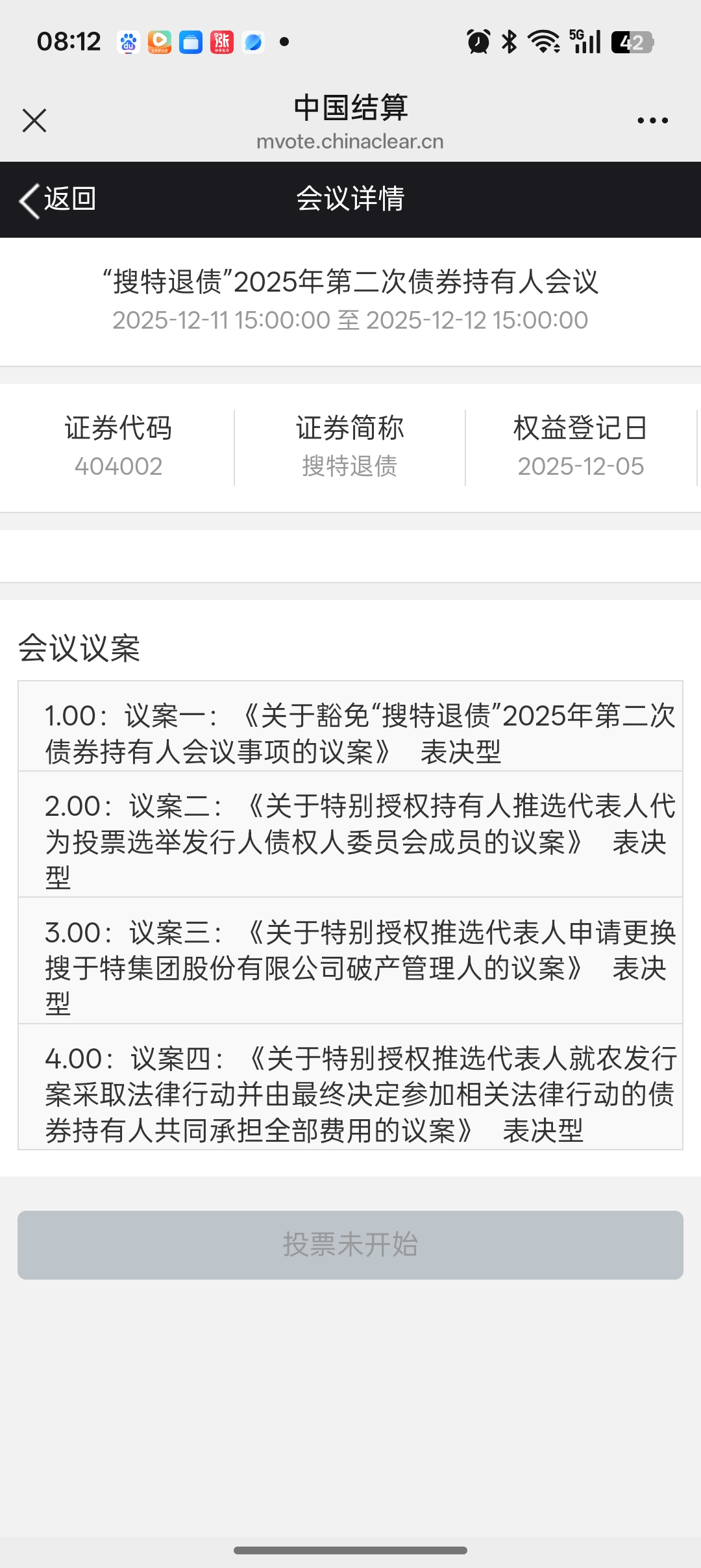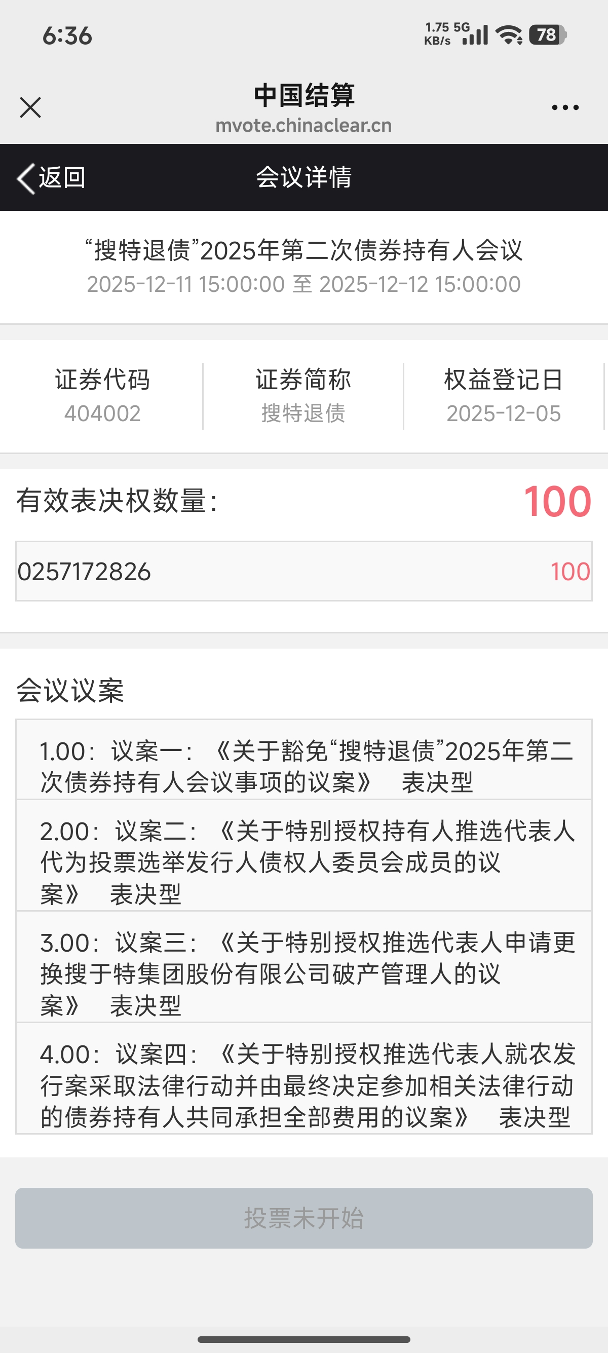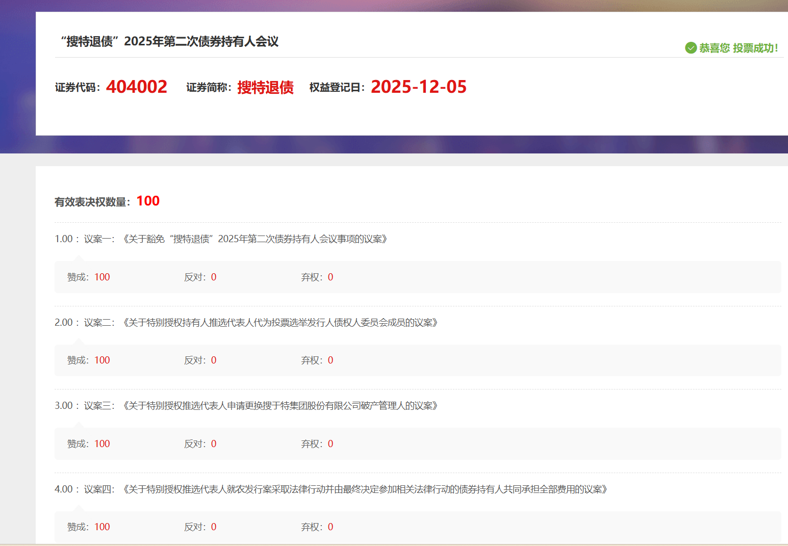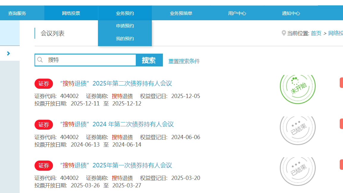 网络投票--》会议列表--》 搜索框 --》“搜特退债”或搜索 “404002” 即可看到 【“搜特退债”2025年第二次债券持有人会议】