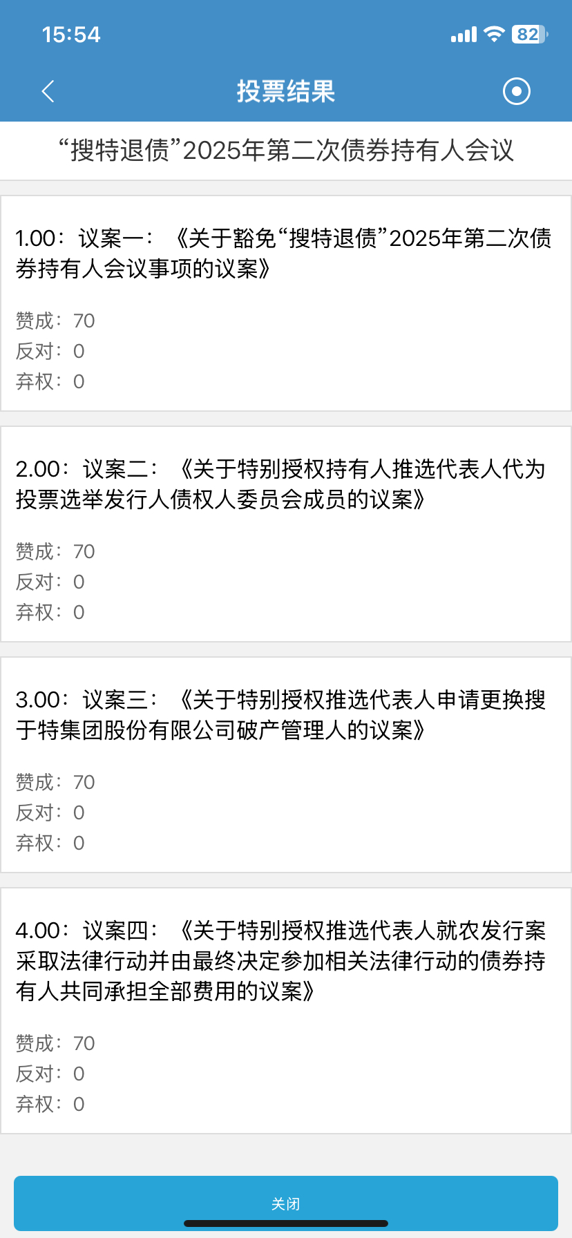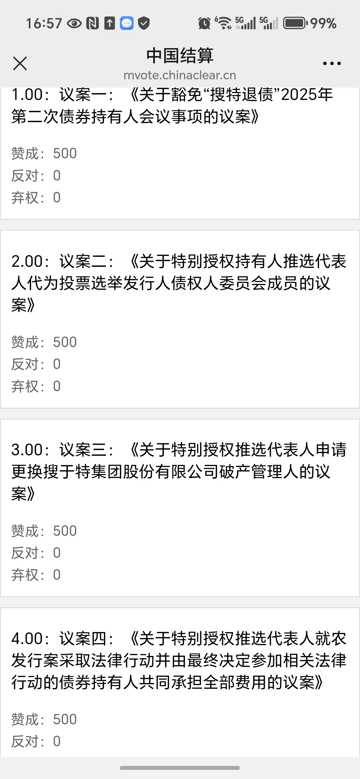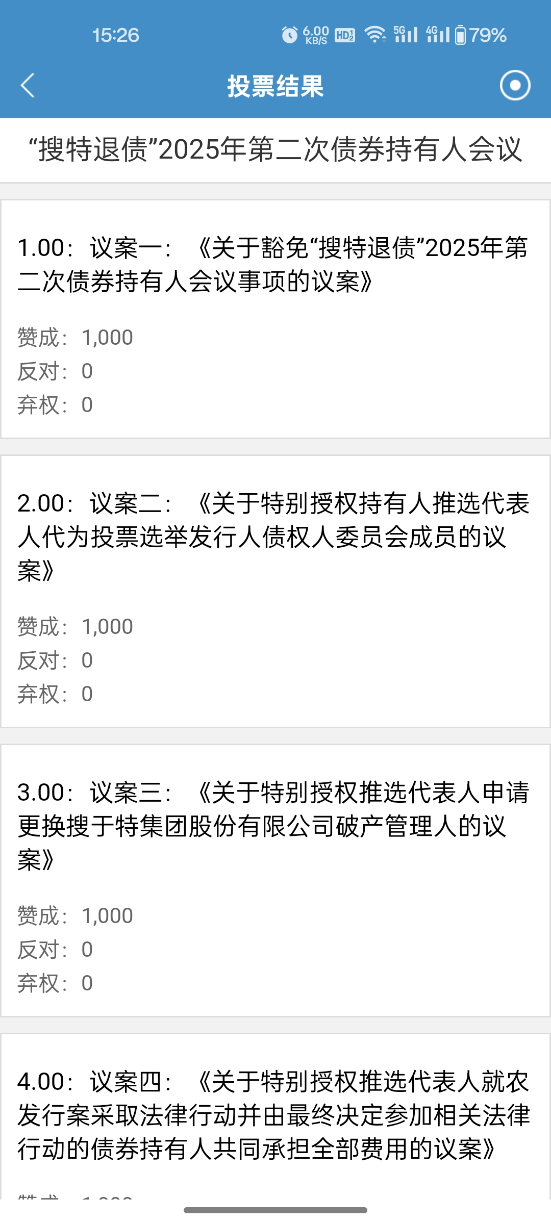 4个议案 全部同意,请大家不要迟疑 !我们搜特退债持有人统一投票,议案一是豁免这次”持有人会议现场会议“需要同意否则后面议案就有风险。 为何免除现场后面详细说,主要是为了在二债会前开,各种曲折后面讲