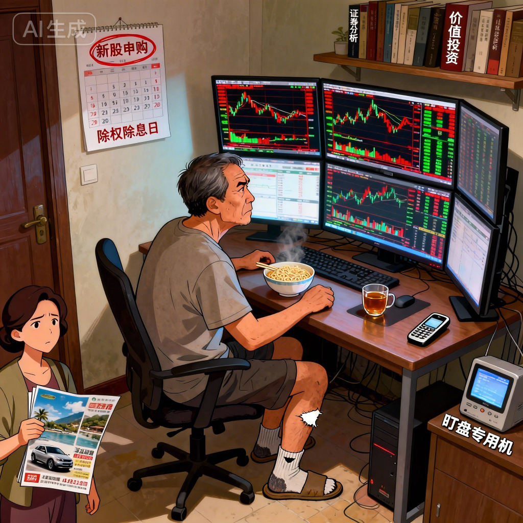 “股市中挥金如土”:与他朴素的穿着形成鲜明对比的是面前豪华的多屏炒股电脑。屏幕上闪烁着红绿绿的K线图、分时图和交易窗口,象征着在资本市场上的大手笔投入。