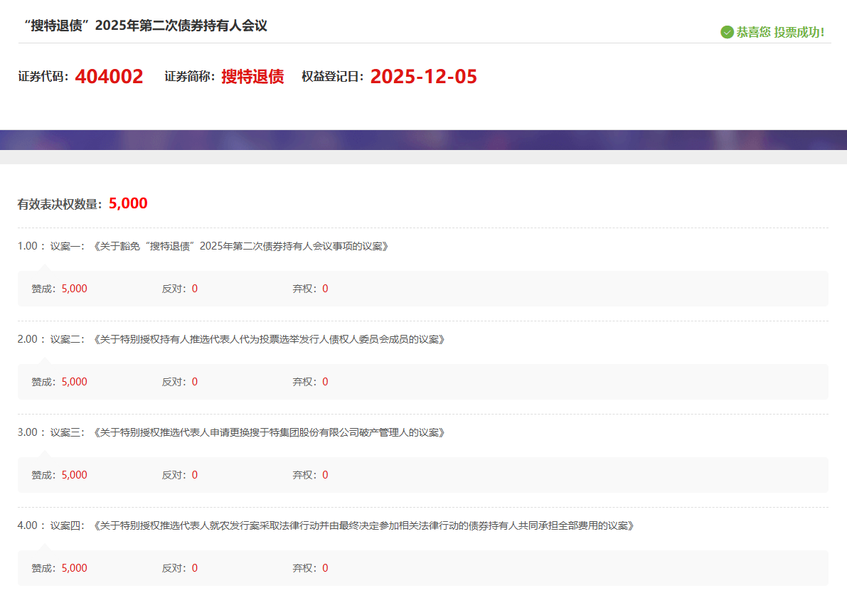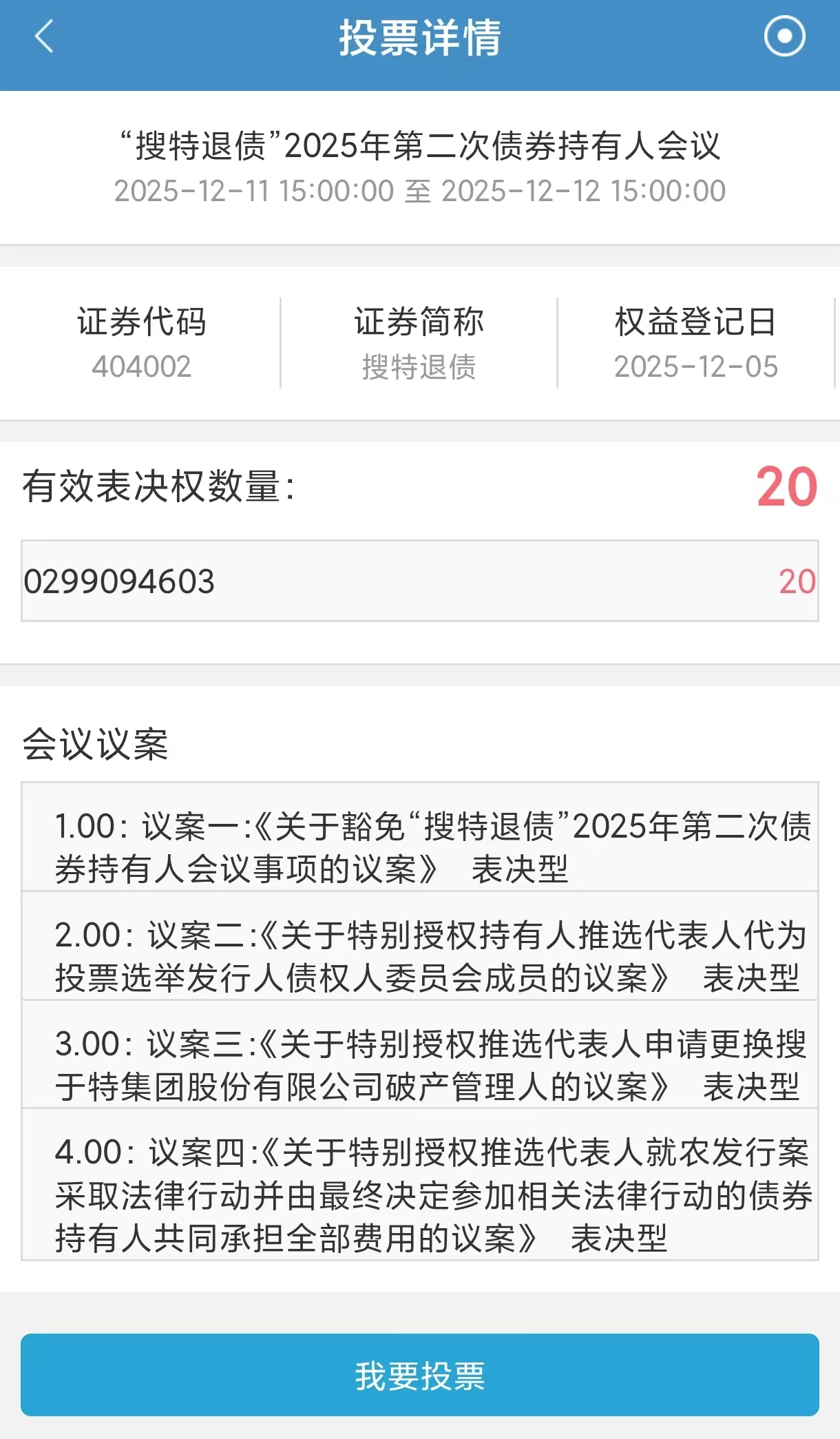 网络投票--》会议列表--》 搜索框 --》“搜特退债”或搜索 “404002” 即可看到 【“搜特退债”2025年第二次债券持有人会议】