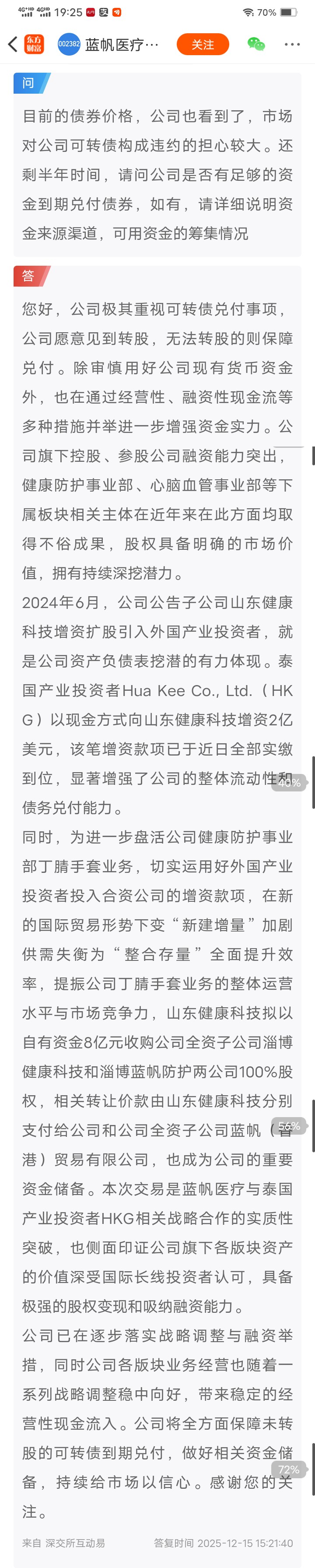 另蓝帆董秘今天刚刚在深交所互动易回答了投资者关于可转债和公司经营的问题,看得出霸气初显,信心十足。